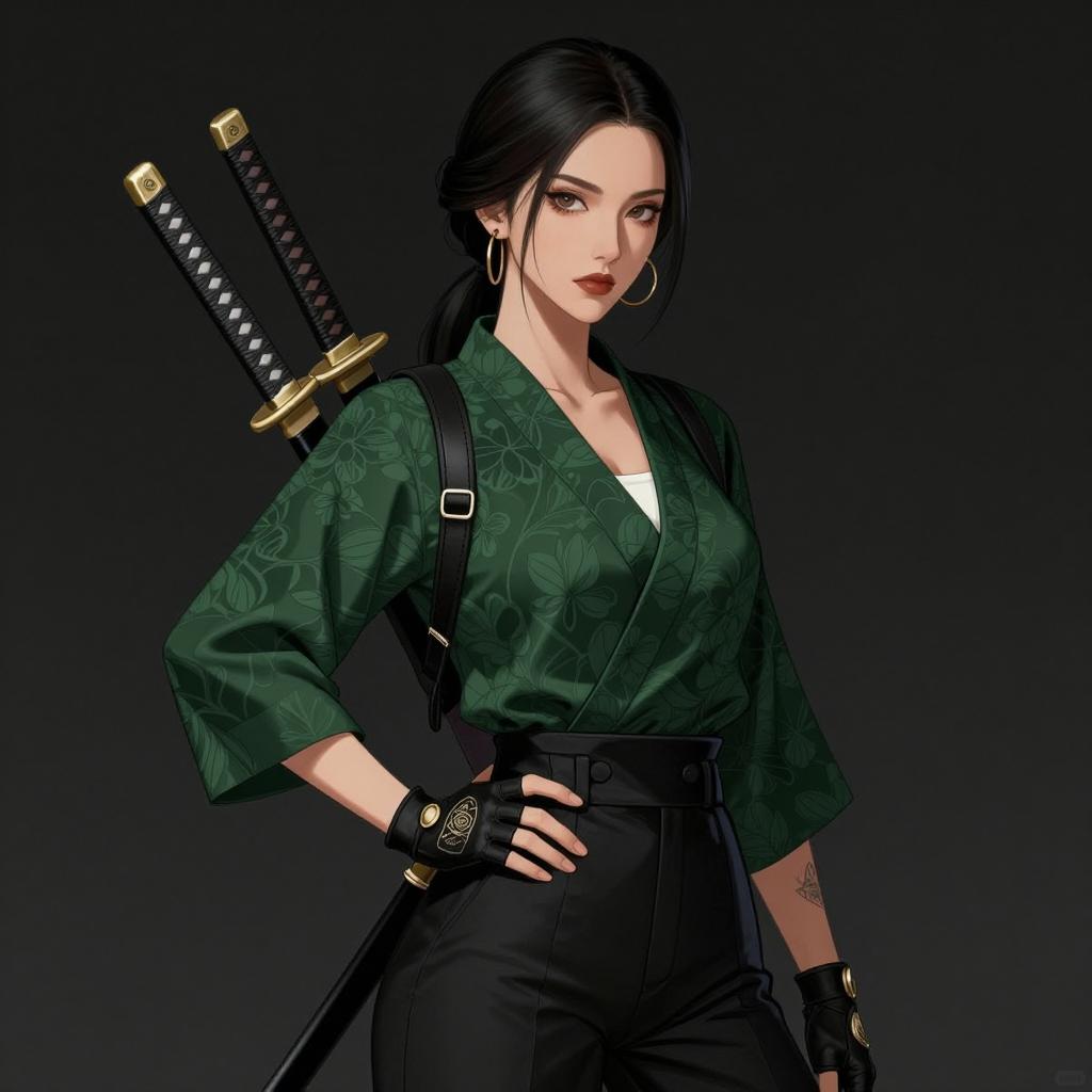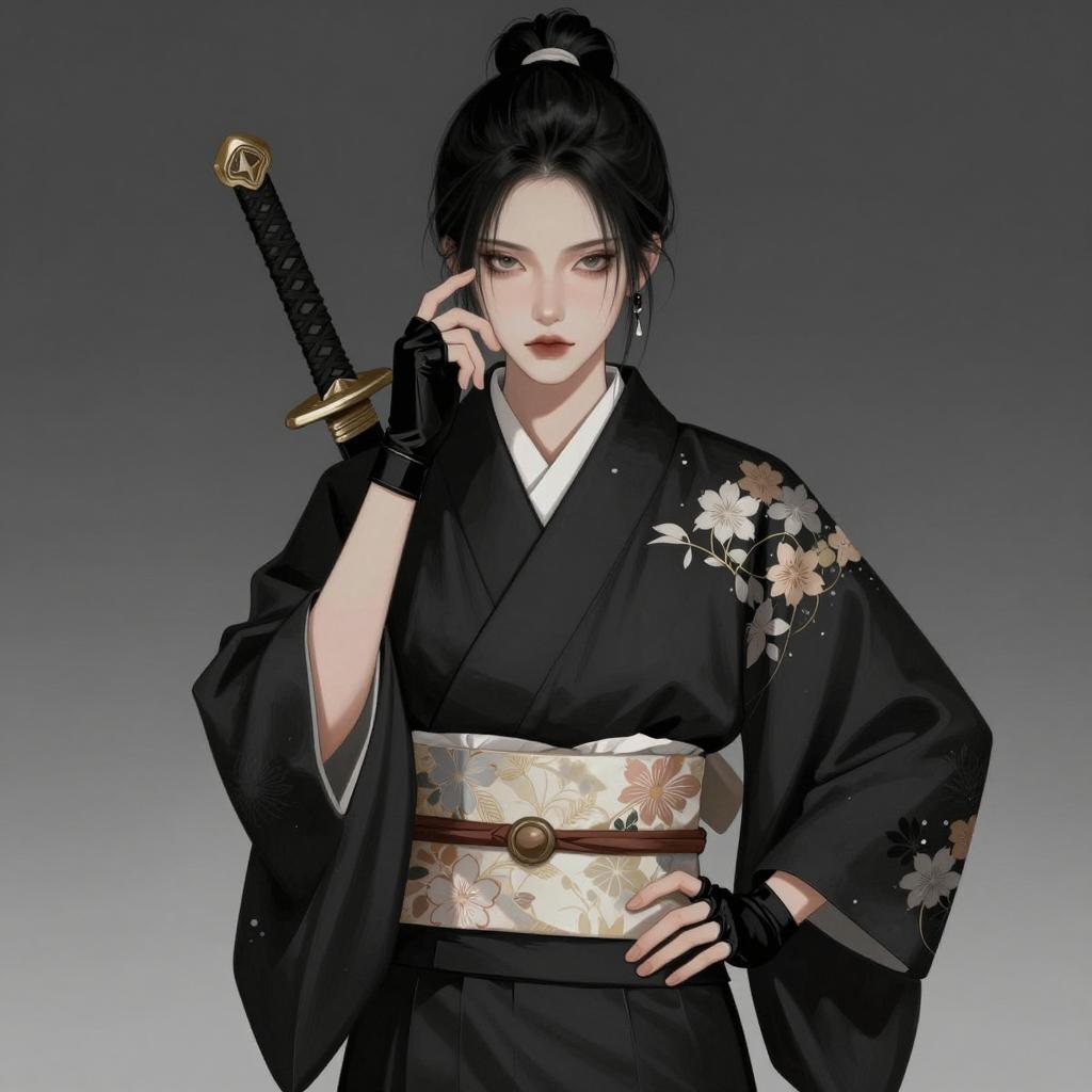 Digital illustration of an Asian woman with pale skin and black hair styled in a high ponytail. She is wearing a black kimono adorned with subtle floral patterns, a white undergarment, and fingerless black gloves. The woman has a katana sheathed on her back, small earrings, and a serious expression. Her right hand is gently touching her face while her left hand rests on her hip, set against a dark gray gradient background.