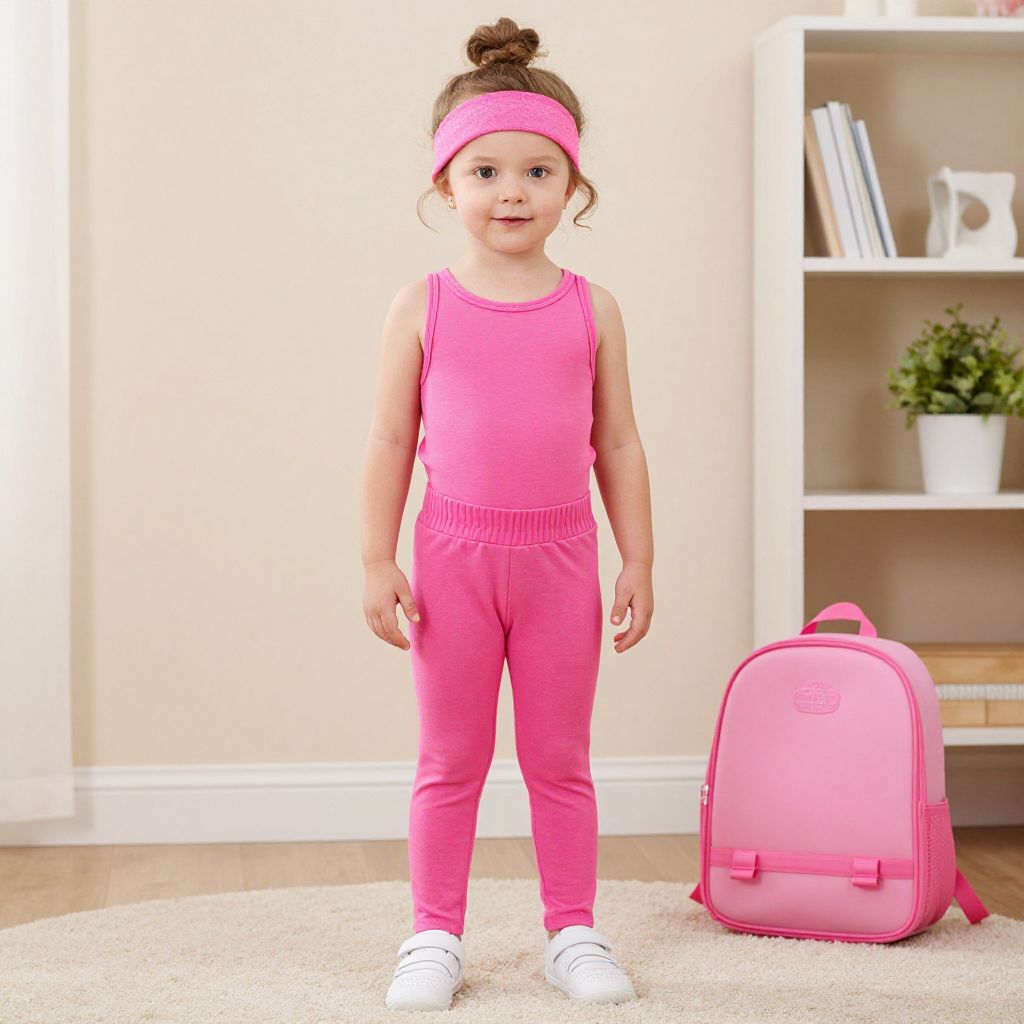 Toddler Workout Girl Costume, little girl standing in a room with a backpack