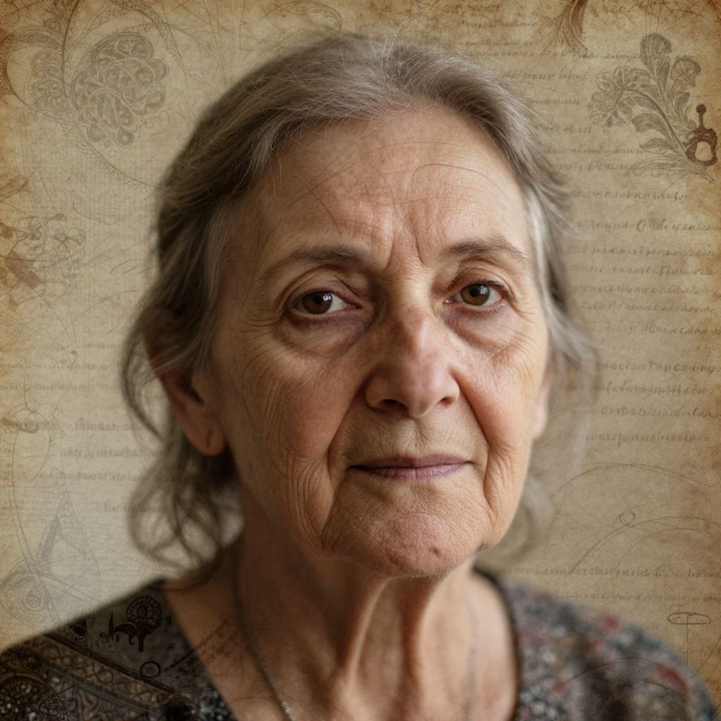 Photograph of an elderly woman with gray hair, wrinkles, and brown eyes, wearing a patterned top, against a textured, parchment-like background.