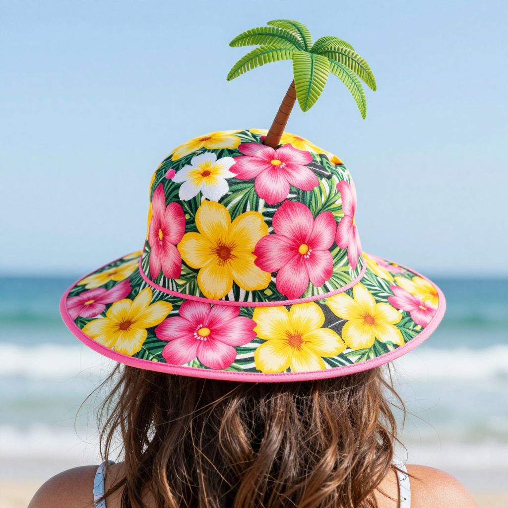Photograph of a person with long brown hair wearing a brightly colored, tropical-themed hat. The hat is a two-tiered design, adorned with large pink, yellow, and white hibiscus flowers on a green leaf background. A small, green palm tree with a brown trunk emerges from the top of the hat. The person's back is facing the camera, and they are standing on a sunny beach with the ocean and clear blue sky in the background. The hat's wide brim is pink, and the sunlight enhances the vibrant colors.