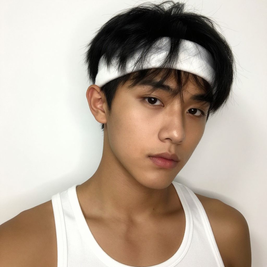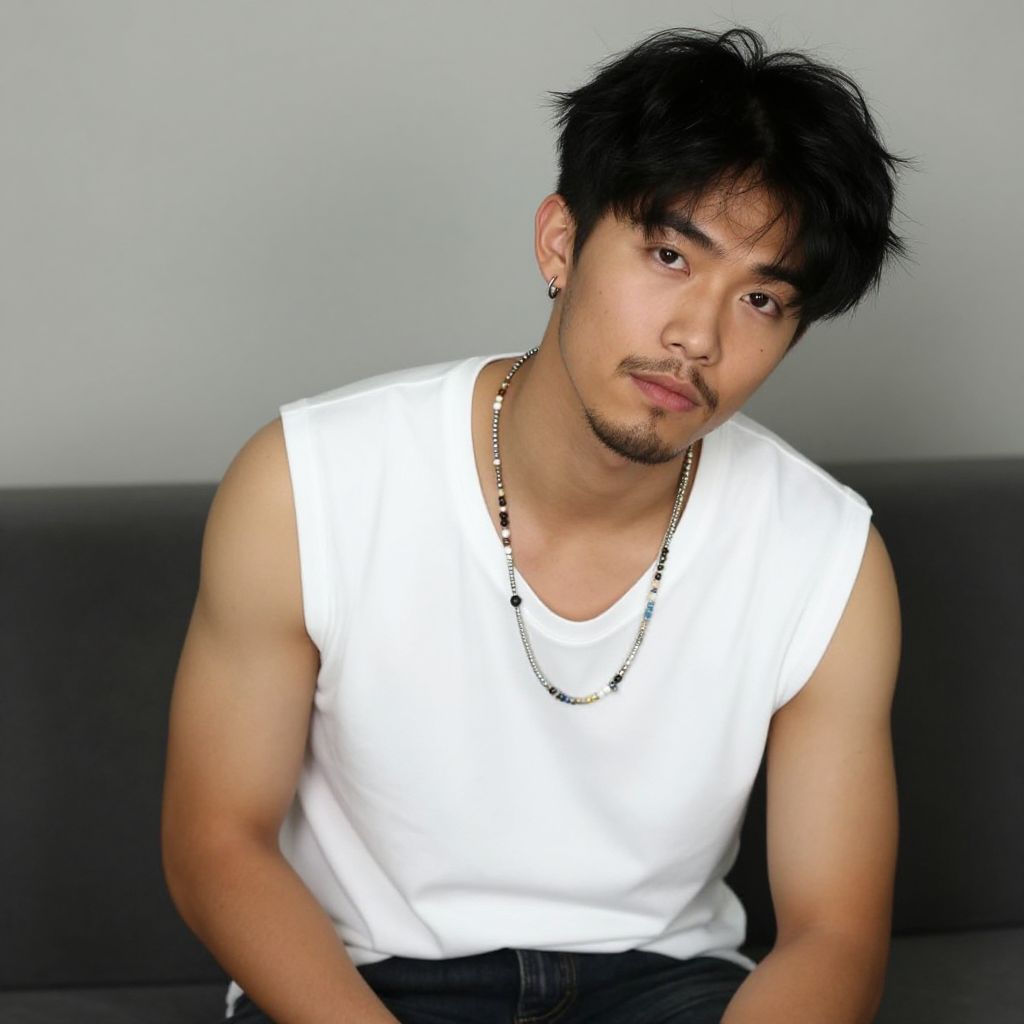 Photograph of a young Asian man with short, messy black hair, wearing a white ribbed tank top and a thin gold chain, against a plain