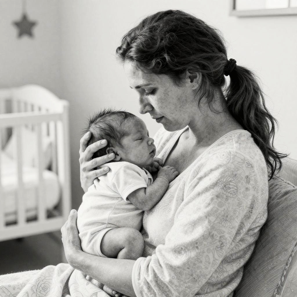 Realistic photo.A highly detailed, emotional sketch-style illustration of a mother cradling her newborn. The scene captures a deep sense of tenderness, with fine linework emphasizing the gentle embrace and the baby's peaceful expression that bring out the intricate textures and subtle movements within the composition. The background features a softly lit nursery, harmonizing with the central subject, adding to the overall atmosphere. Every aspect, from the delicate play of light and shadow to the subtle elements of nature, such as soft blankets or gentle lullabies, is rendered with thoughtful shading and delicate strokes to convey a sense of calm and reflection. realistic photo