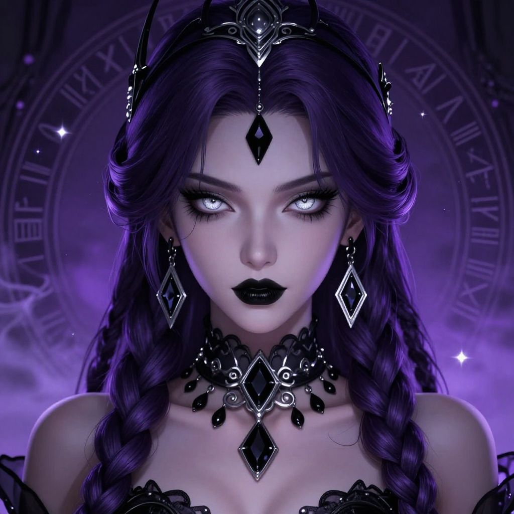 Digital artwork of a pale, alluring witch with glowing white eyes, purple hair, black lipstick, and intricate black diamond jewelry, set against a mystical