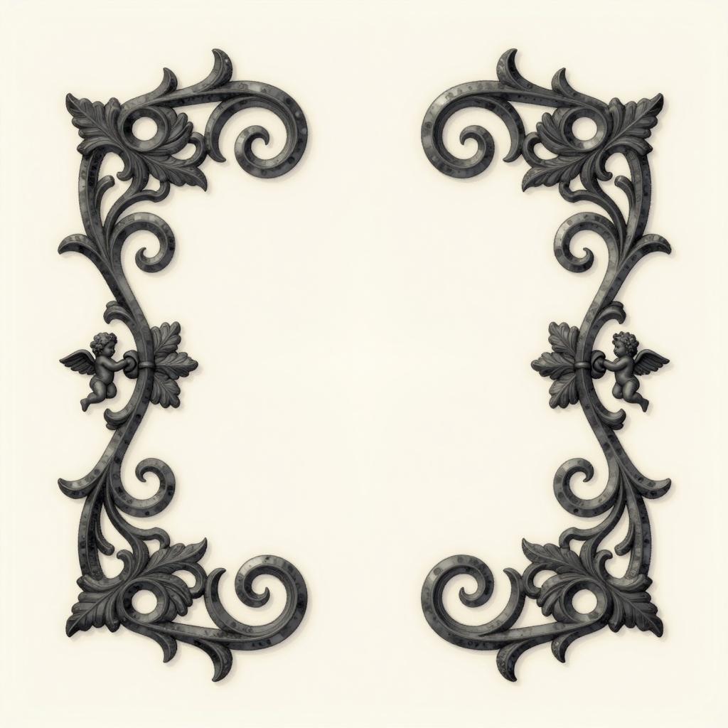 Scrollworks pattern featuring ornate church-altar style scrolls with cherub accents in matte black scrollwork on pale ivory arranged as symmetrical mirror-image scrolls left and right of center on digital UI background for a fantasy game rendered as watercolor wash background with sharp line-art scrolls, ultra-detailed, sharp ornamental design, high resolution, intricate decorative pattern art
