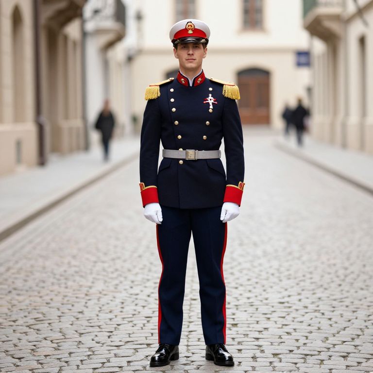 Prince Charming, boy in a military uniform standing on a cobblestone street