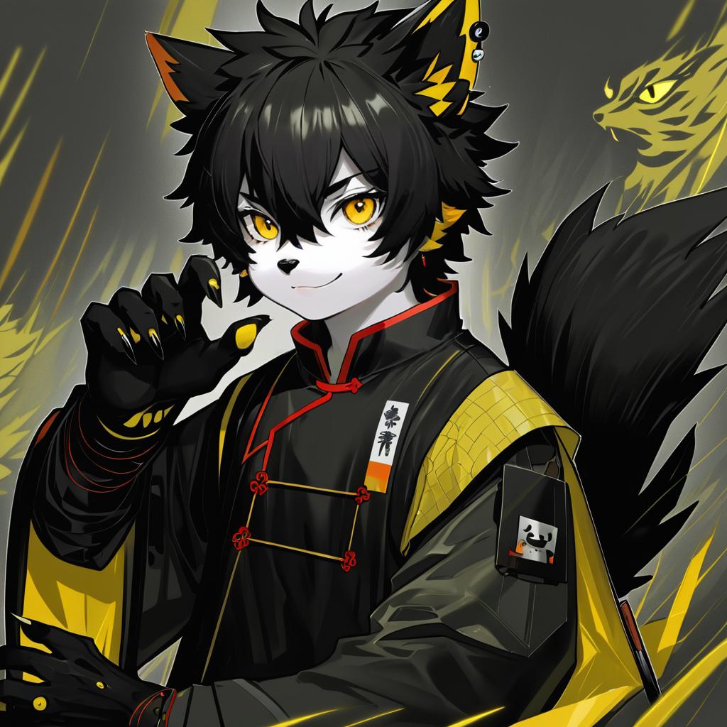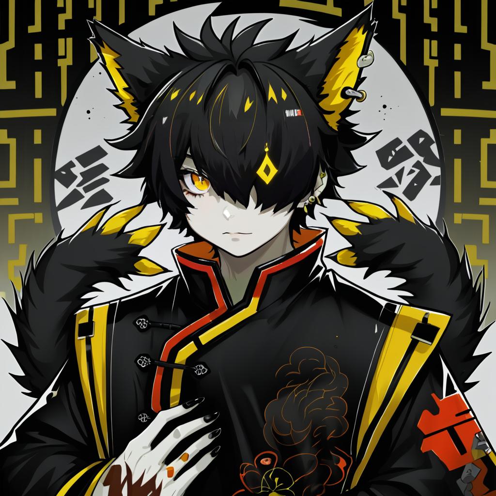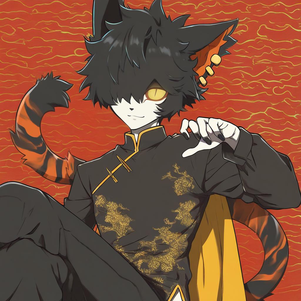 Aak (arknights), arknights, 1boy, furry male, cat boy, cat ears, ear piercing, tail, animal ears, yellow eyes, slit pupils, hair over one eye, black hair, short hair, chinese clothes, black nails, yellow sclera, by artist yamakawa, anime