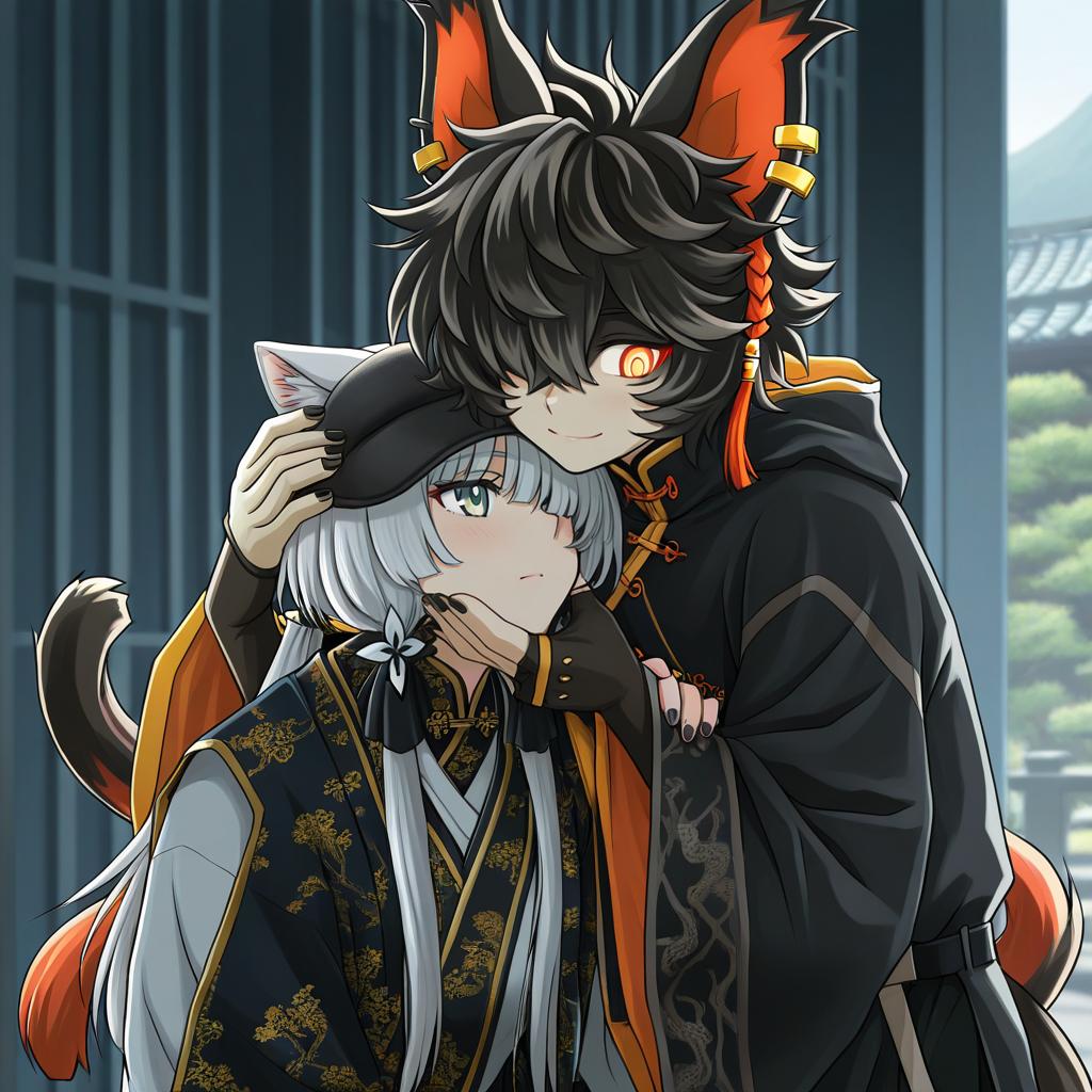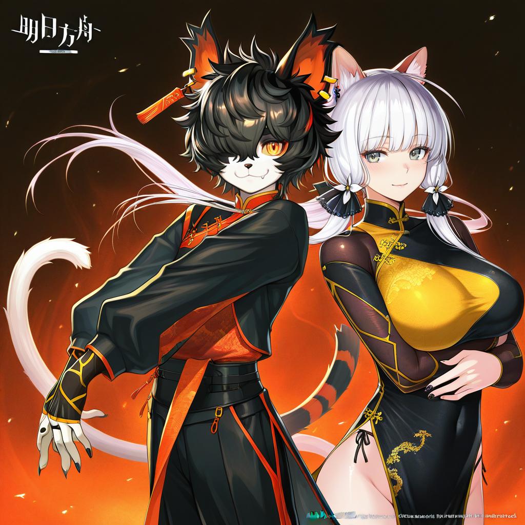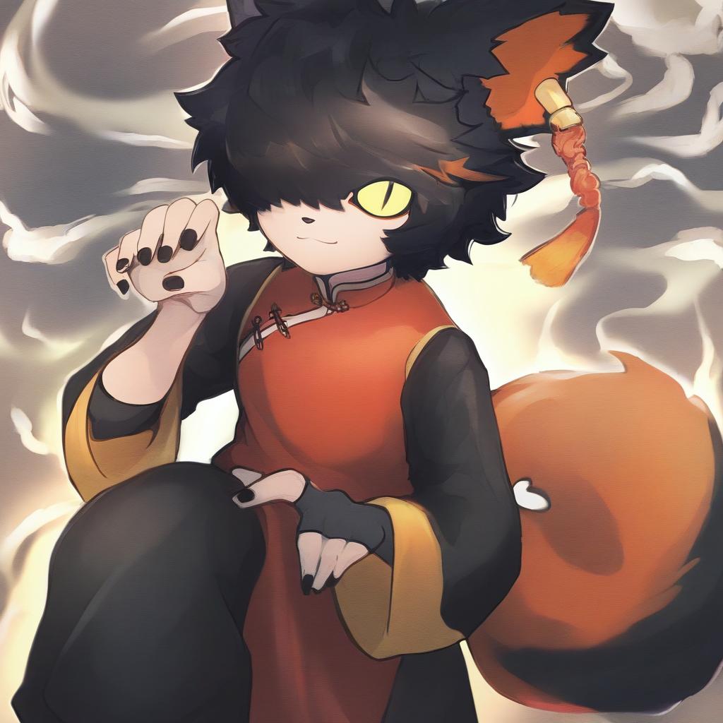 Aak (arknights), arknights, 1boy, furry male, cat boy, cat ears, ear piercing, tail, animal ears, yellow eyes, slit pupils, hair over one eye, black hair, short hair, chinese clothes, black nails, yellow sclera, by artist yamakawa, anime