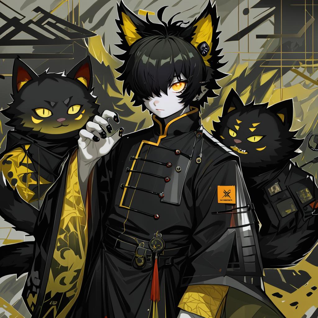 Digital illustration of a male anthro cat character with black fur, yellow cat ears, and yellow eyes with slit pupils, styled hair partially covering one eye. He wears a detailed black and yellow traditional Chinese-inspired outfit with ornamental buttons and accessories. Two large black anthropomorphic cats with yellow markings accompany him in the background. The artwork combines anime and furry art styles with a dark, modern color palette.