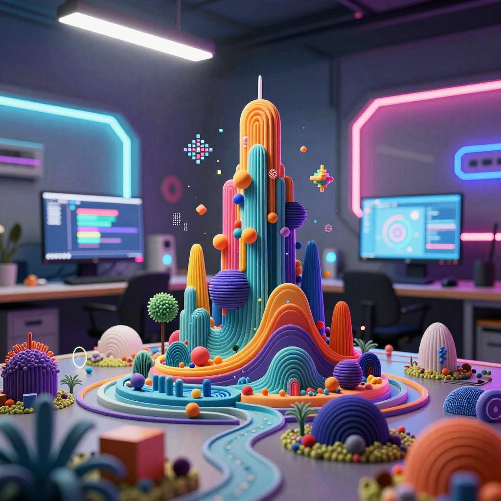 Photograph of a vibrant, futuristic office space with a neon-lit background. The centerpiece is a colorful, 3D wireframe sculpture featuring abstract, wave-like structures in orange, blue, and purple, with cacti and small spherical shapes scattered around. Two computer monitors with glowing screens flank the sculpture, casting blue and pink neon light. The room has a modern, techy aesthetic with dark furniture, potted plants, and sleek, minimalistic decor. The image has a highly stylized, almost CGI-like quality with sharp, bright colors and geometric shapes, creating a dynamic, futuristic atmosphere.