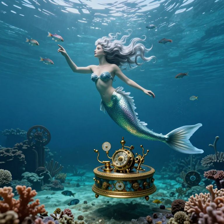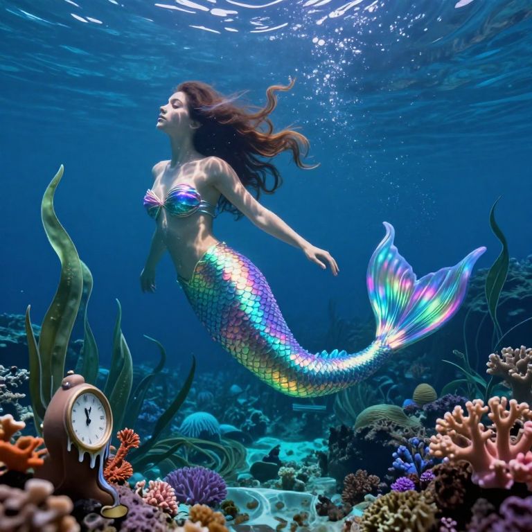 Create an enigmatic digital artwork depicting a surreal underwater realm where molten timepieces flow like liquid gold, forming captivating patterns around a majestic mermaid reclining in their midst. From an aerial viewpoint, showcase this whimsical scene with the mermaid's iridescent skin shimmering under the soft, ethereal glow of an abstract sun, casting elongated shadows that emphasize the dreamlike atmosphere and eerie mood. This fantastical composition merges surreal imagery with fluid water elements to evoke a sense of wonder, curiosity, and enchantment.