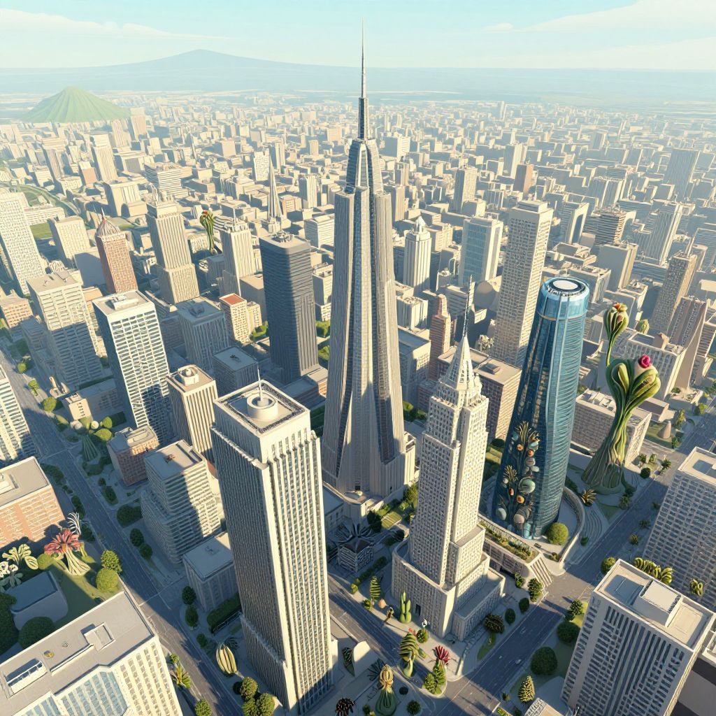 A CGI-rendered aerial view of a sprawling cityscape featuring a prominent, sleek skyscraper with two tapering, glass-covered spires in the center. Surrounding buildings vary in height and design, with a mix of rectangular and cylindrical shapes. Sunlight casts sharp shadows, highlighting the buildings' textures and geometric forms. The background extends to a hazy horizon, blending into a pale blue sky. Streets with trees and occasional vehicles weave through the dense urban landscape. The image has a modern, realistic style with crisp lines and vibrant colors.