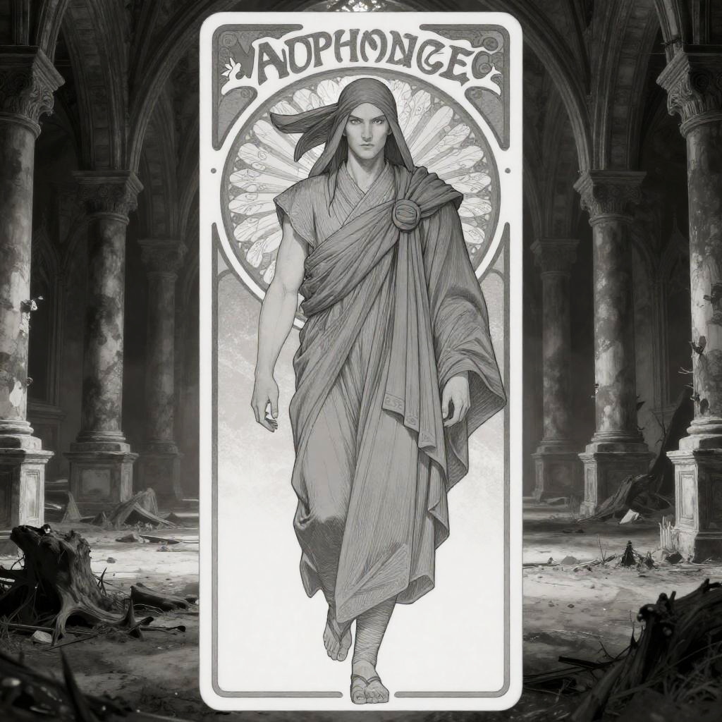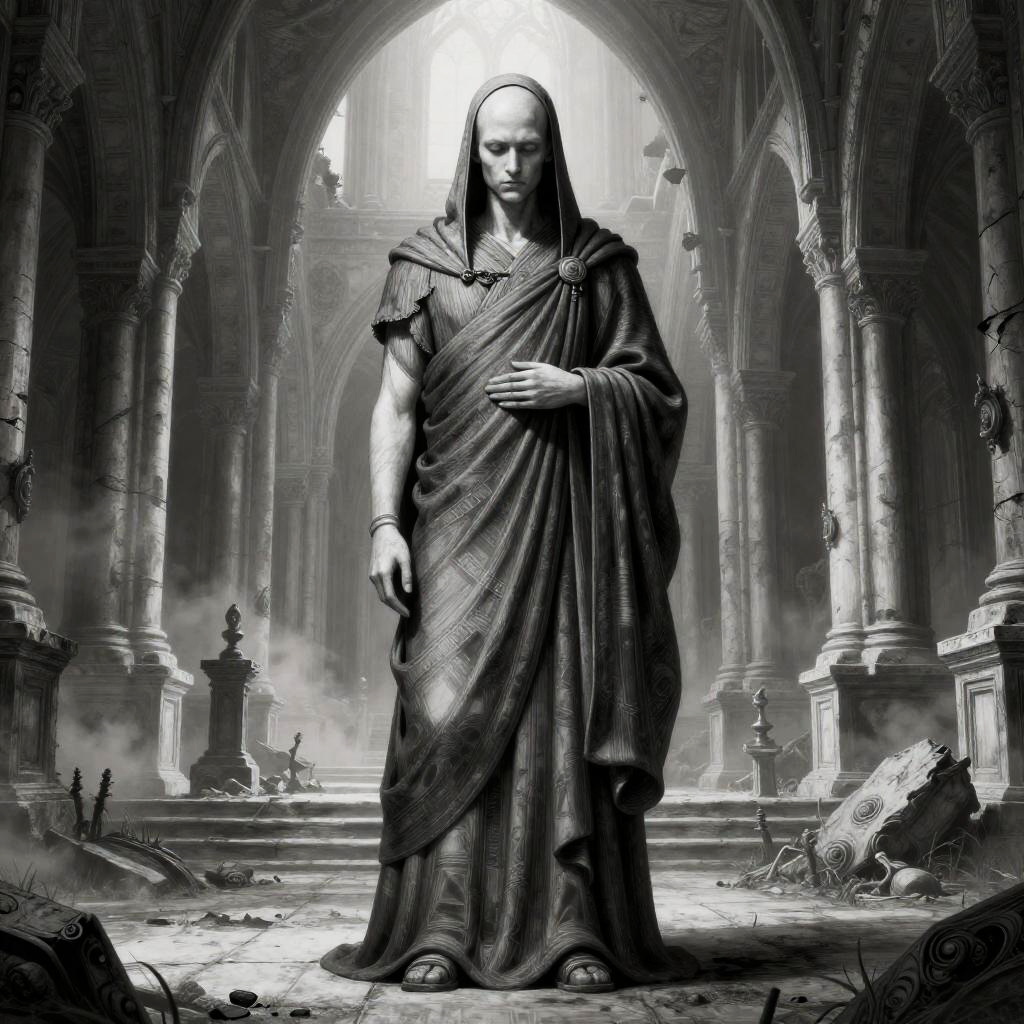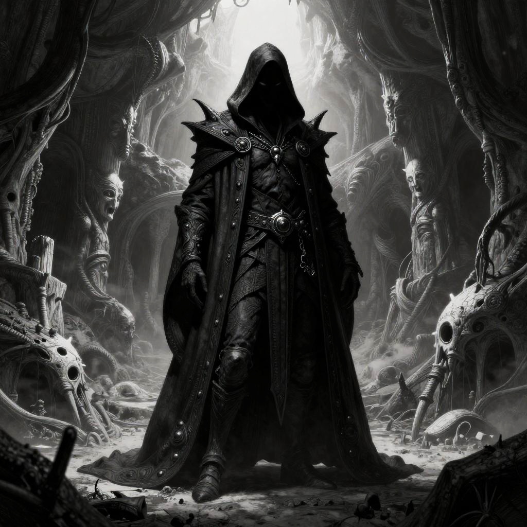 Character design featuring a majestic sorceress set in a shimmering waterfall surrounded by an eerie atmosphere, inspired by Alphonse Mucha, highly detailed, fine lines, sharp details, black and white, hyper maximalist, dramatic.
