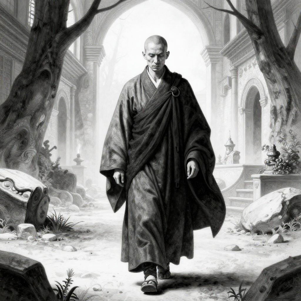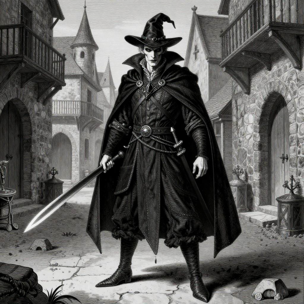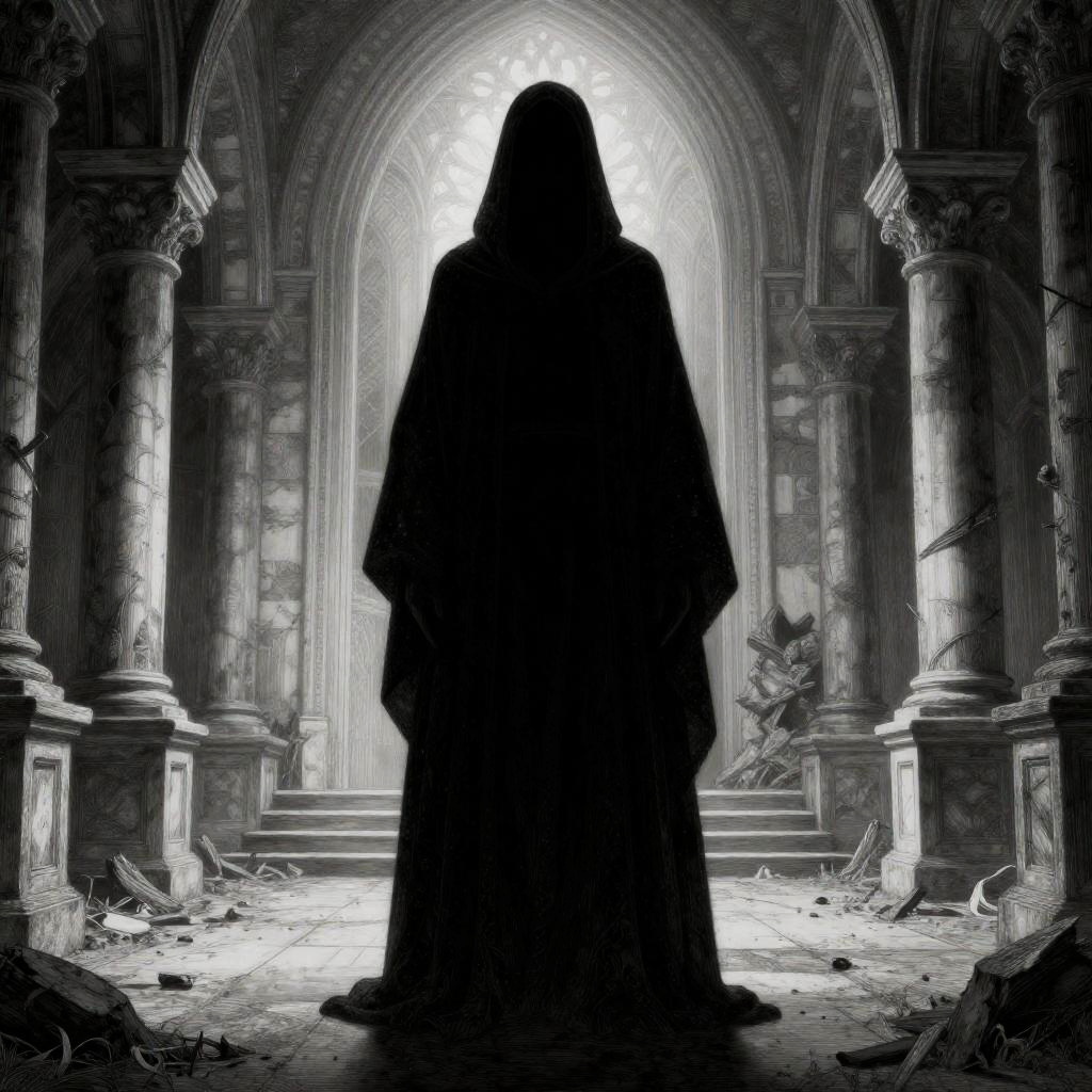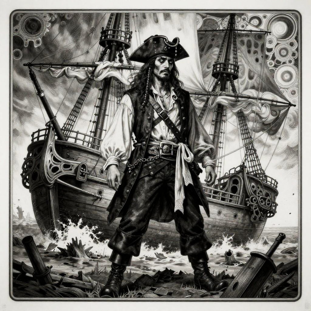 Character design featuring a majestic sorceress set in a shimmering waterfall surrounded by an eerie atmosphere, inspired by Alphonse Mucha, highly detailed, fine lines, sharp details, black and white, hyper maximalist, dramatic.