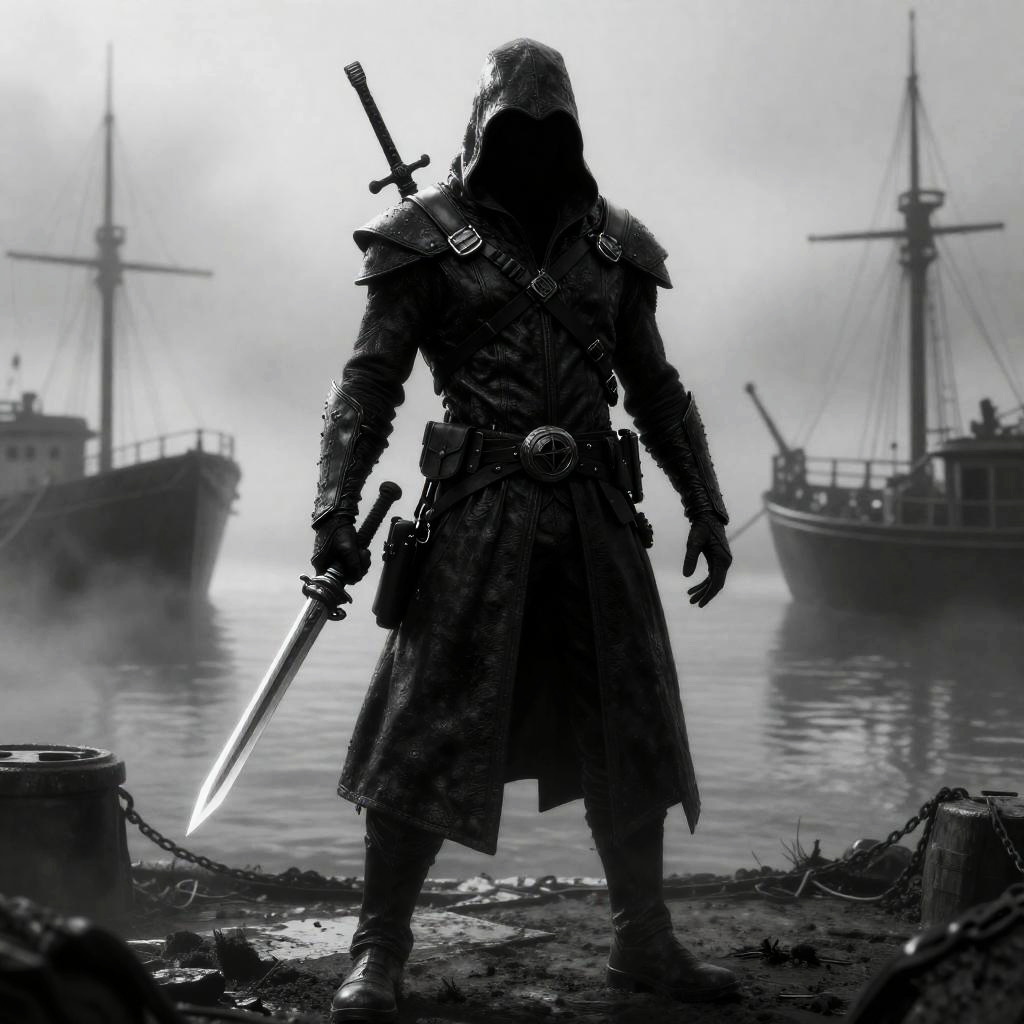 Black and white highly detailed character design of a majestic sorceress standing gracefully in front of a shimmering waterfall. The sorceress wears an elaborate ornate gown with armor elements and a crown, exuding power and elegance. Her long flowing hair and intricate jewelry highlight fine lines and sharp details, set against an eerie, dramatic natural environment with cascading water and rocky cliffs. The artwork is inspired by Alphonse Mucha with a hyper maximalist style.