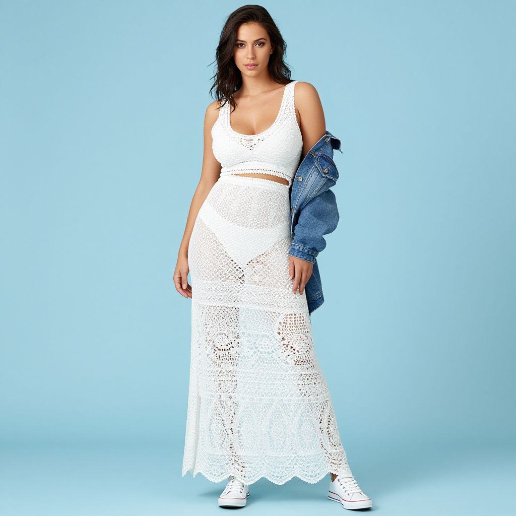 Photograph of a light-skinned woman with wavy black hair, standing against a solid light blue background. She wears a white, sleeveless, crocheted crop top and a matching long skirt with intricate lace patterns. Draped over her right arm is a blue denim jacket. She stands confidently, looking directly at the camera, with white ankle-strap sandals on her feet. The overall style is casual yet elegant, with a focus on the textured, delicate lace of her outfit. The lighting is bright and even, highlighting the details of her attire and the simplicity of the background.