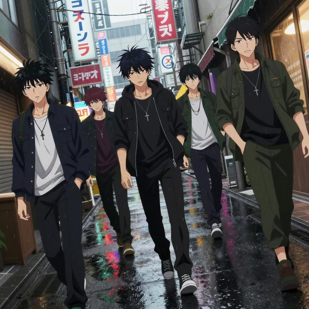Anime-style digital illustration of five black-haired, black-clothing boys walking in a neon-lit, rain-soaked urban alley at night.