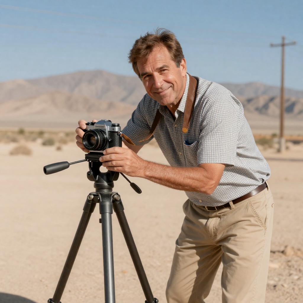 Middle-aged man with brown hair, wearing sunglasses and a black jacket over a white shirt, holding a vintage camera. Bright sky with clouds and green trees in the background. Profile view, focused expression. Daytime outdoor setting.