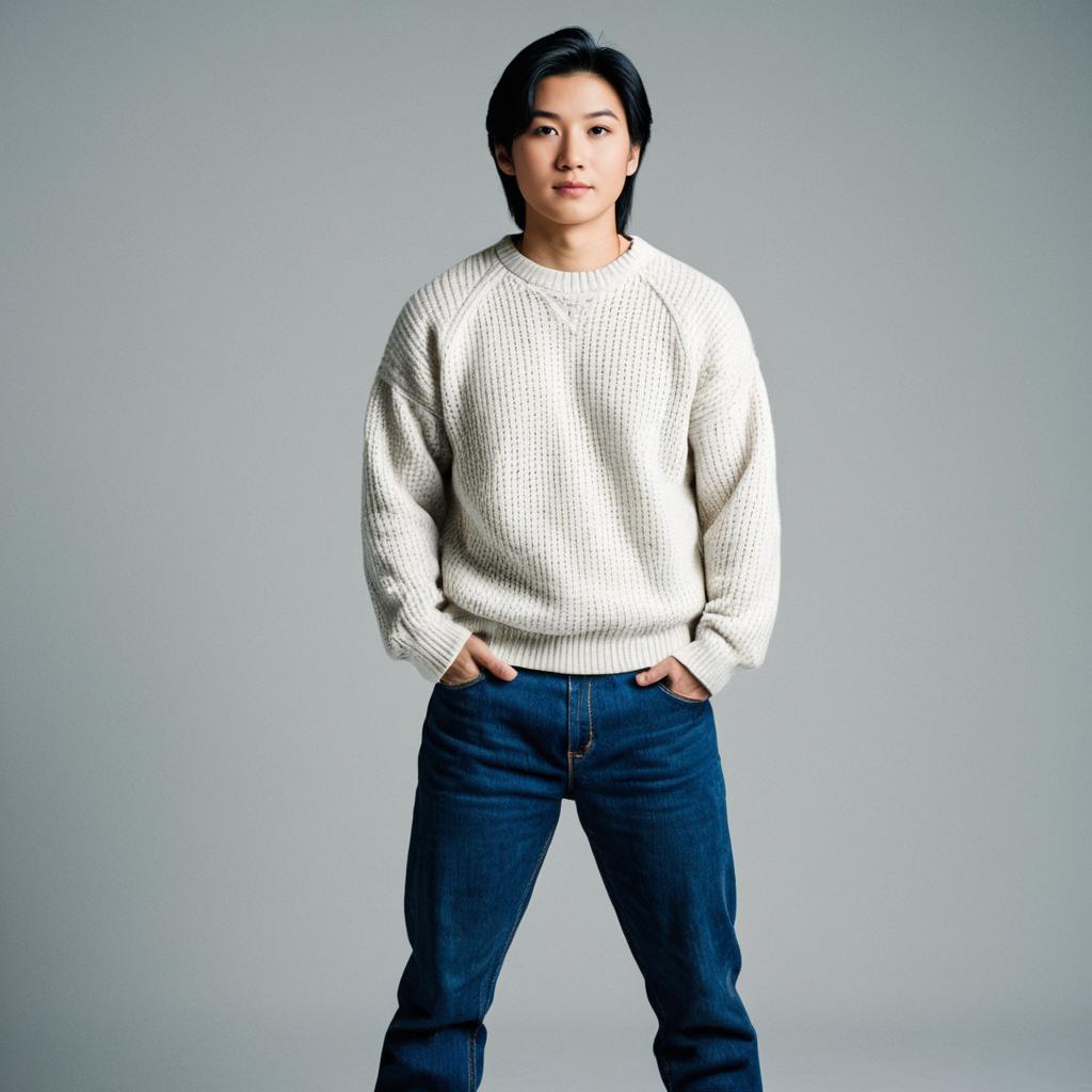 Funny gym sweaters,1boy, solo, male focus, realistic, blue pants, grey background, looking at viewer, pants, simple background, asian, jeans, long sleeves, denim, black hair, standing, arms at sides, sweater, closed mouth, shirt, cowboy shot, brown eyes, white shirt