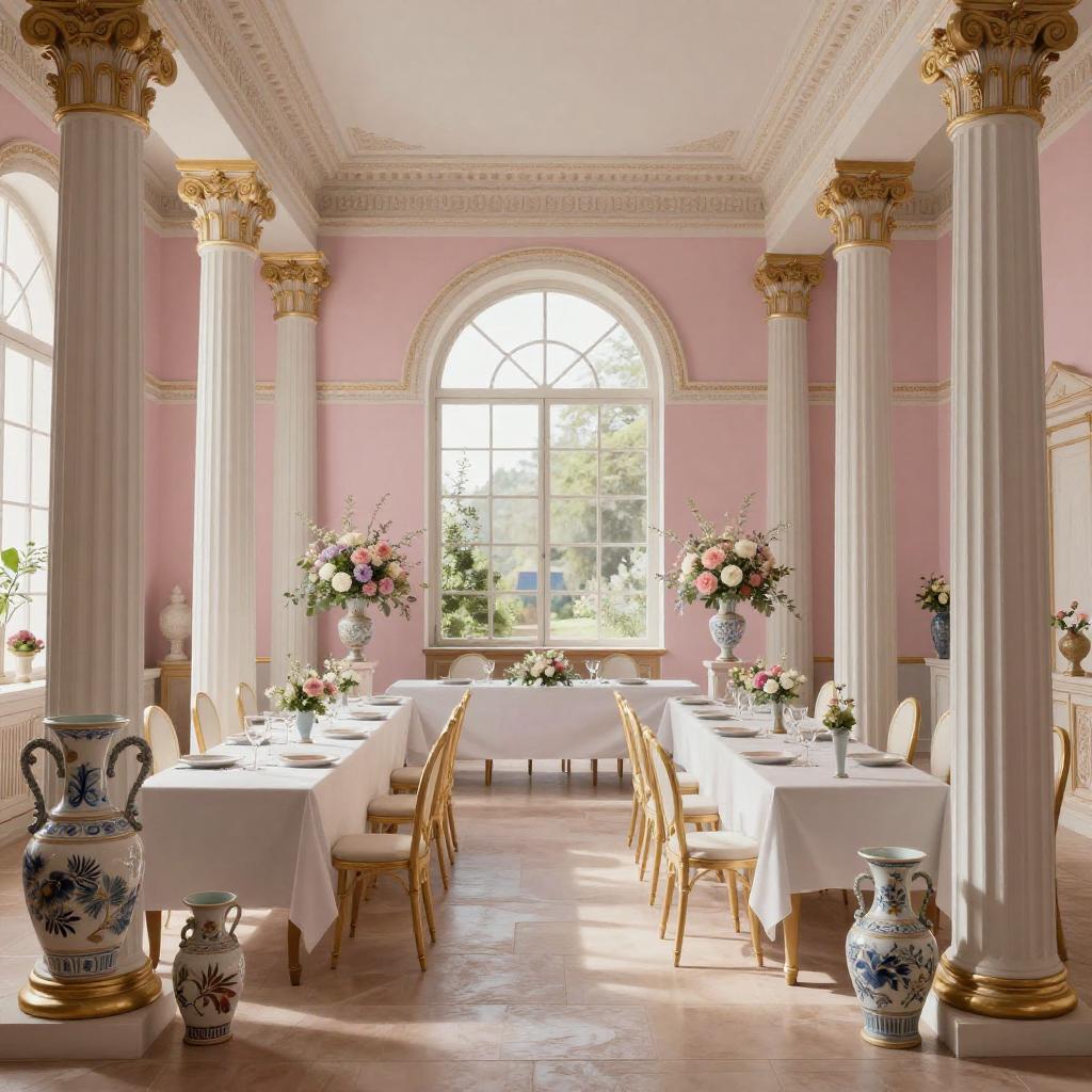A hyper-realistic CGI interior scene of an ancient Greek symposium featuring pastel pink walls, tall white columns with gold accents, and large arched windows allowing natural light. The space is decorated with detailed porcelain vases and floral arrangements that add softness to the elegant classical architecture.