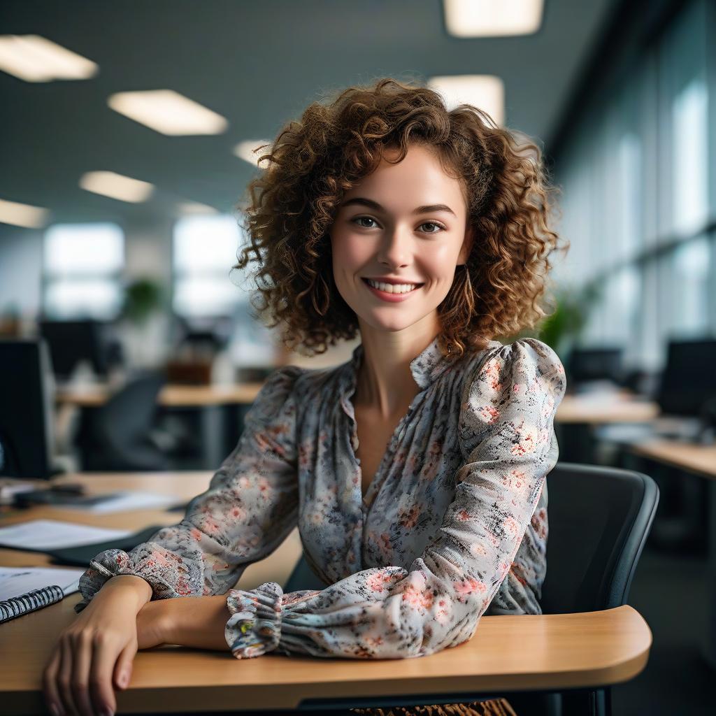 Portrait of a young woman with curly hair wearing a floral blouse, sitting at a desk in a modern office environment. She is smiling and looking at the camera, with office furniture and large windows visible in the background.