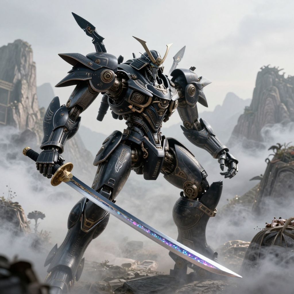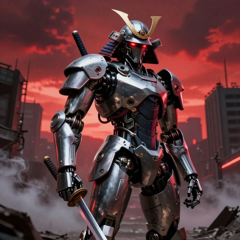 Futuristic cyberpunk samurai robot with glowing red eyes, wearing a detailed shiny tungsten armor with metallic components including bolts, wires, and intricate mechanical parts. The robot holds a katana and stands amidst ruins on a smoky city street under an ominous red sky with stormy clouds at sunset, creating a dramatic industrial military atmosphere.