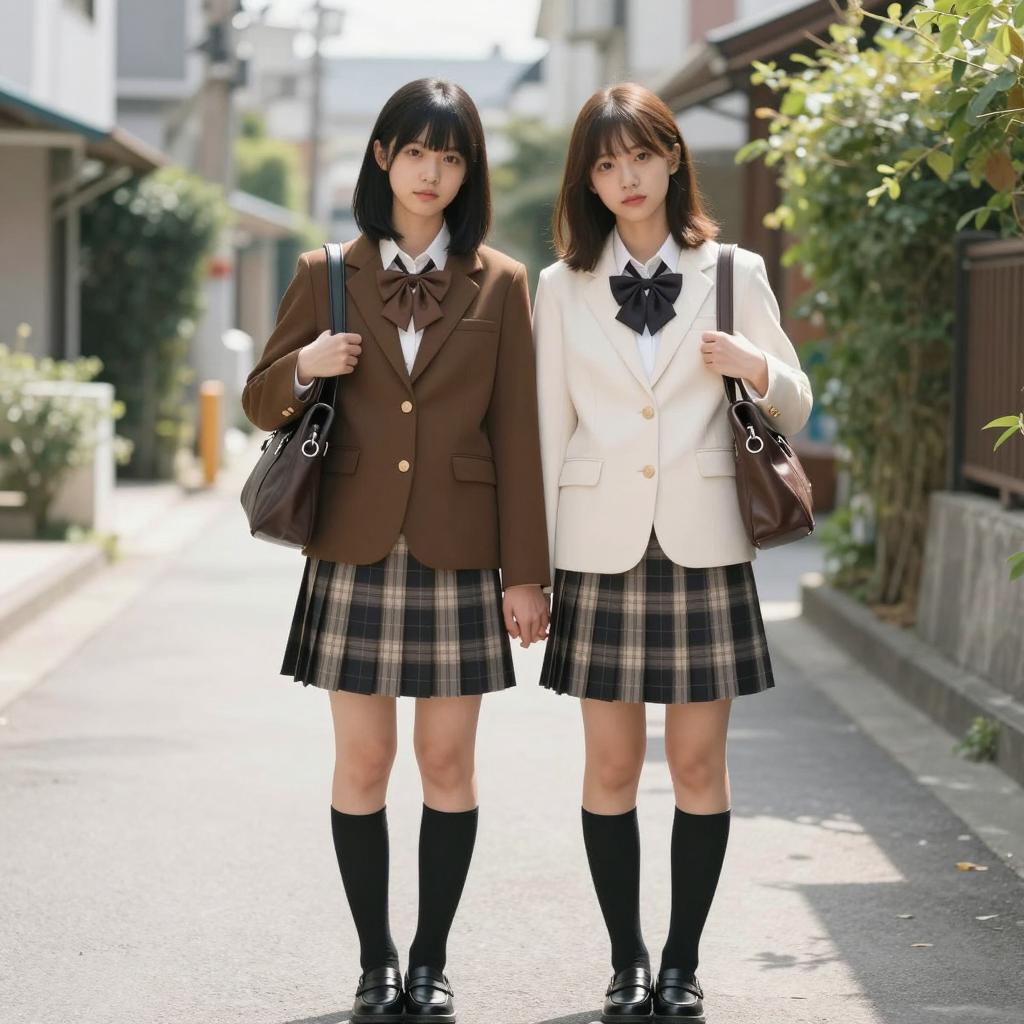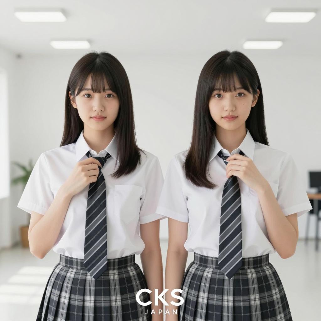 Two young Asian women with straight black hair, wearing white short-sleeve shirts, black and grey striped ties, and grey plaid skirts. Both hold their ties. White room with ceiling lights. Standing side by side, smiling slightly. Upper bodies facing forward. "CKS JAPAN" at bottom center.