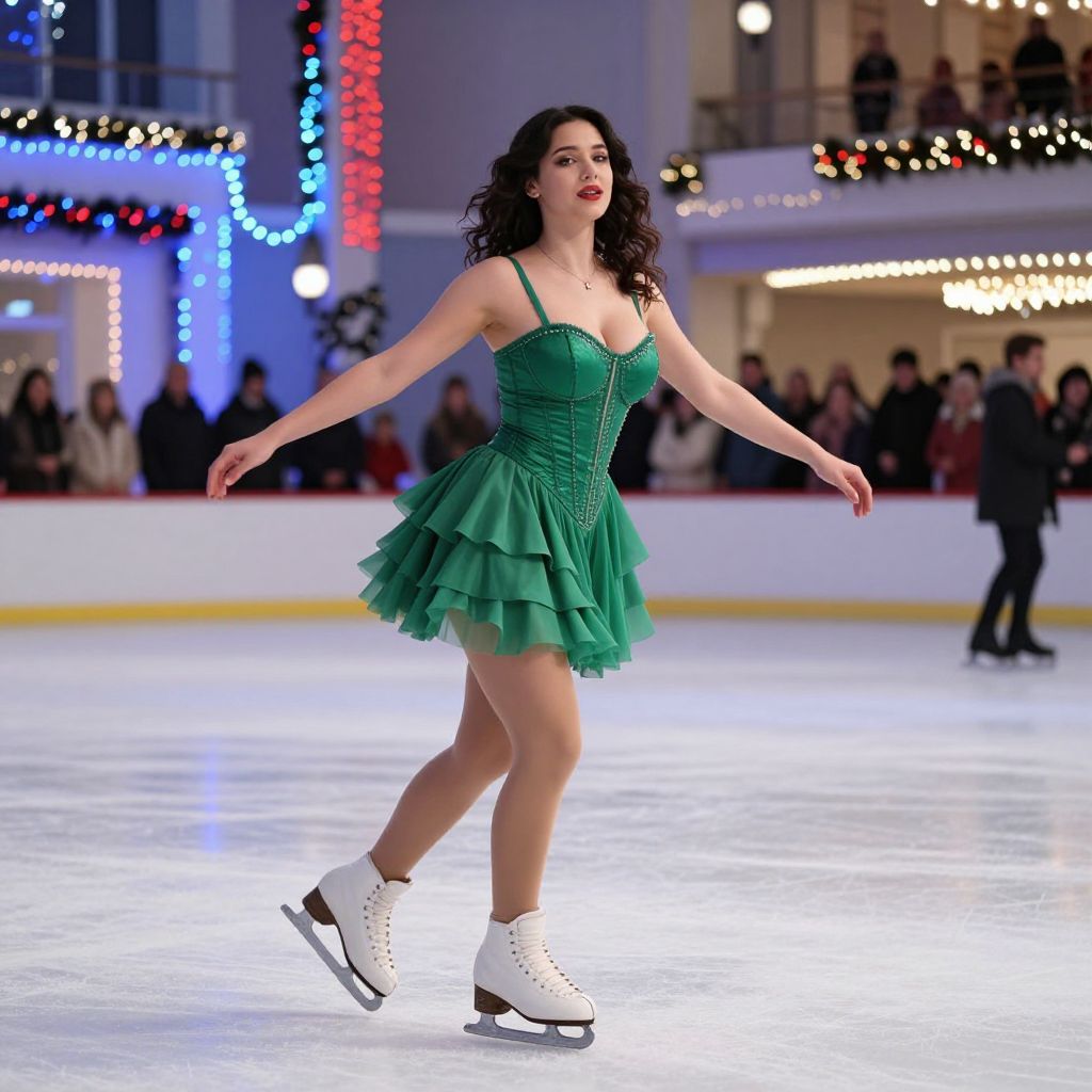 A stylish woman with wavy dark hair and sharp cheekbones wears a full green ice skating dress with a corset-style upper and a tiered green skirt, skating gracefully on a well-lit indoor rink during a winter themed event; the setting includes holiday decorations, glowing blue and red lights, and a festive crowd in the background.. The woman has big tits and cute face