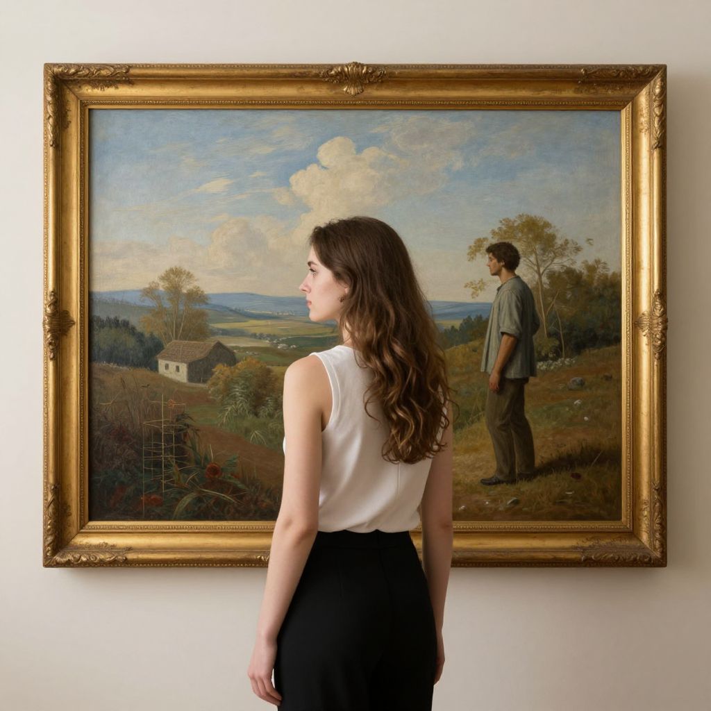 A woman stands before a golden-framed painting that defies reality, its serene landscape seamlessly merging with the figure of a man who appears to emerge from the canvas, blurring the line between art and life.