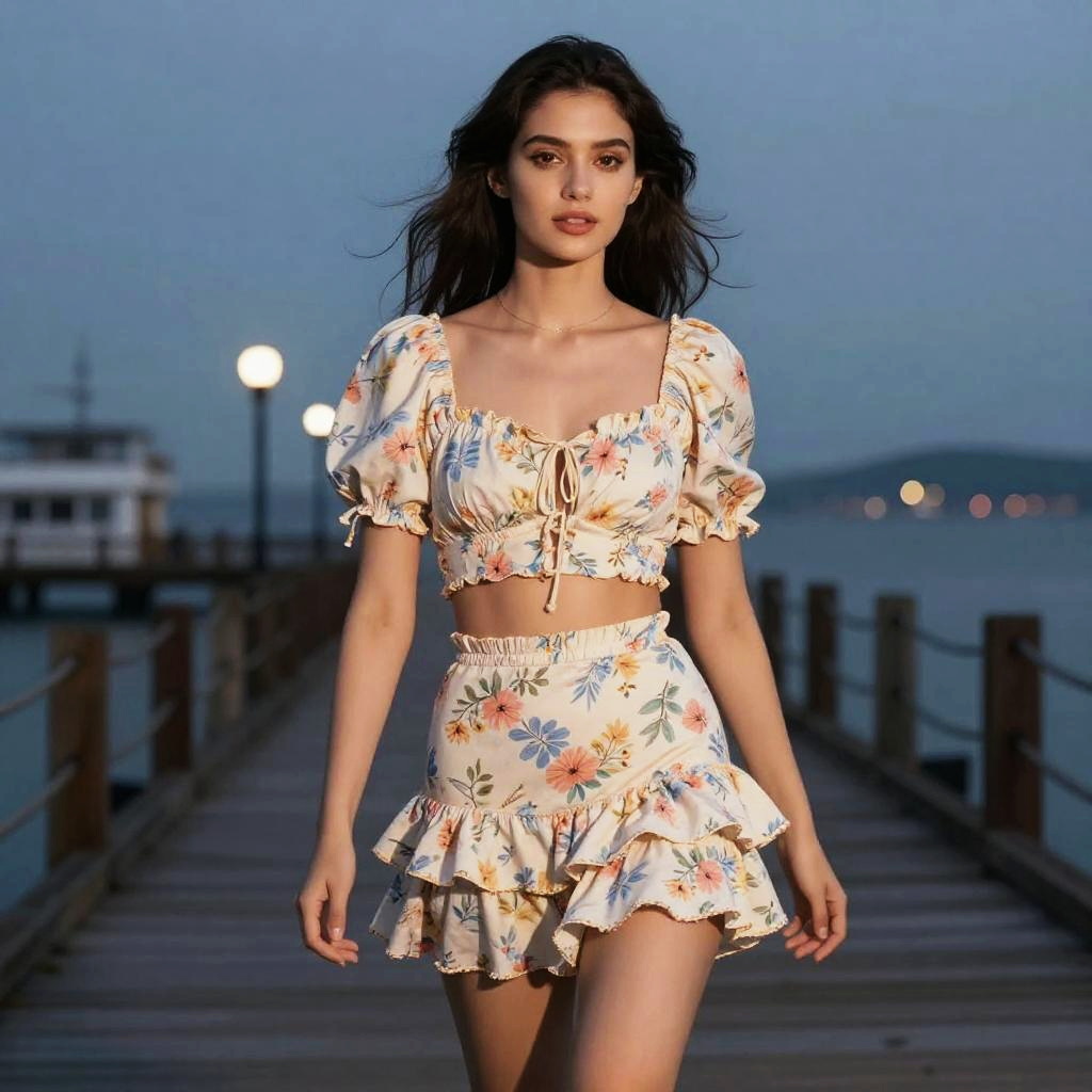 A woman in a floral print two-piece set, featuring a cropped top with puff sleeves and a high-waisted ruffled mini skirt, styled in the visual aesthetic of Mappa Studio, enjoying an evening walk on the pier. Sexy. Pretty face and beutiful eyes