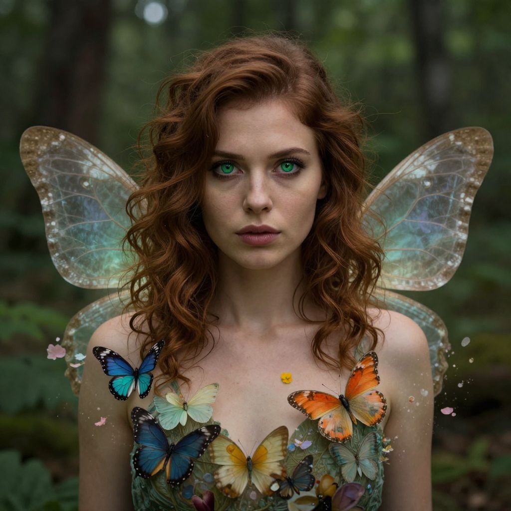 Photograph of a fair-skinned, green-eyed young woman with wavy, auburn hair standing in a forest. She has translucent, iridescent fairy wings and wears a dress adorned with colorful butterflies, including blue, orange, and yellow. The butterflies are semi-transparent with detailed patterns. Her expression is serious and she gazes directly at the camera. The background is blurred, showcasing dark green foliage. The image has a magical, fantasy-like quality with a focus on the woman's ethereal appearance. The lighting is soft, highlighting her features and the butterflies' vibrant colors.