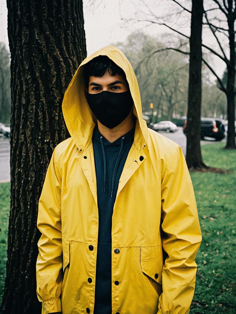 Portrait of a young man wearing a bright yellow raincoat with the hood up and a black face mask. He is standing outdoors near a tree on a cloudy day with a blurred background of green grass, trees, and parked cars. The man has dark hair and is dressed in casual clothing including a dark hoodie underneath the raincoat.