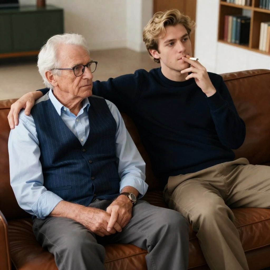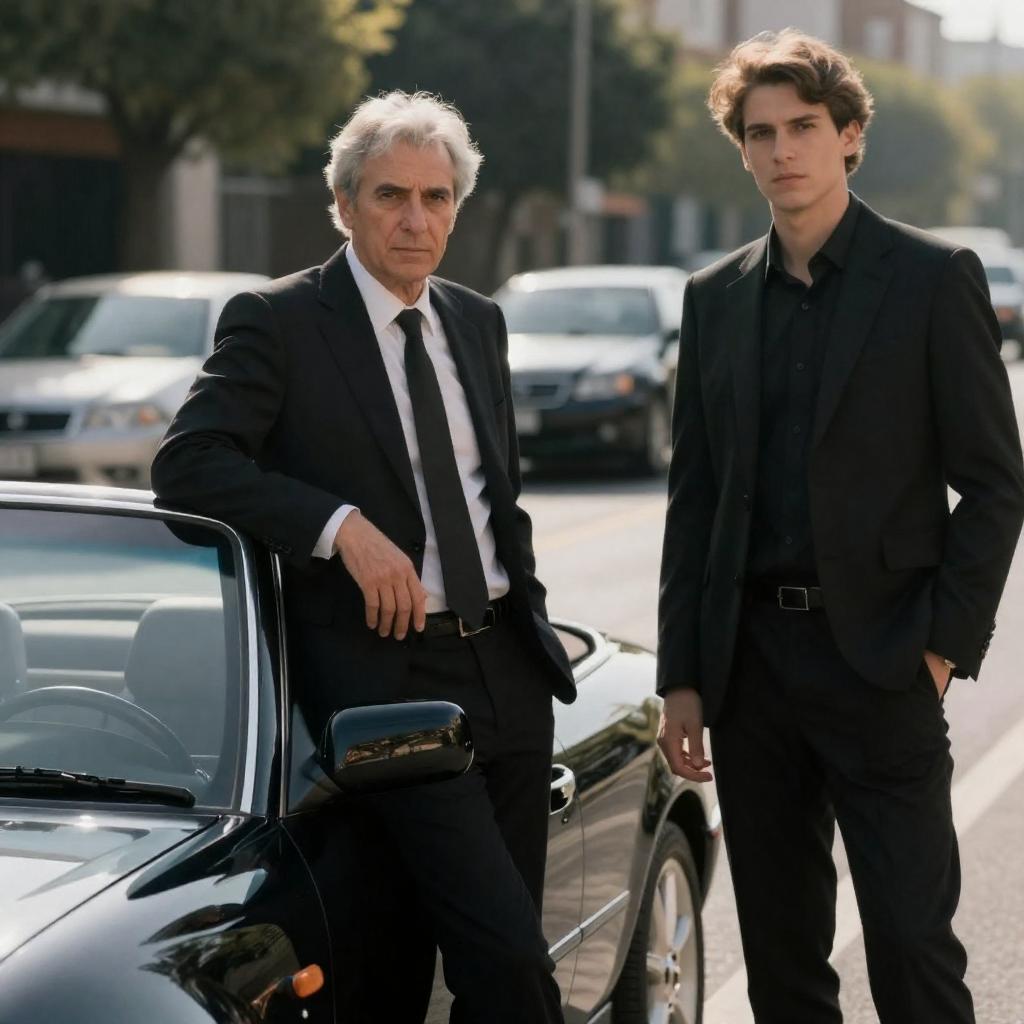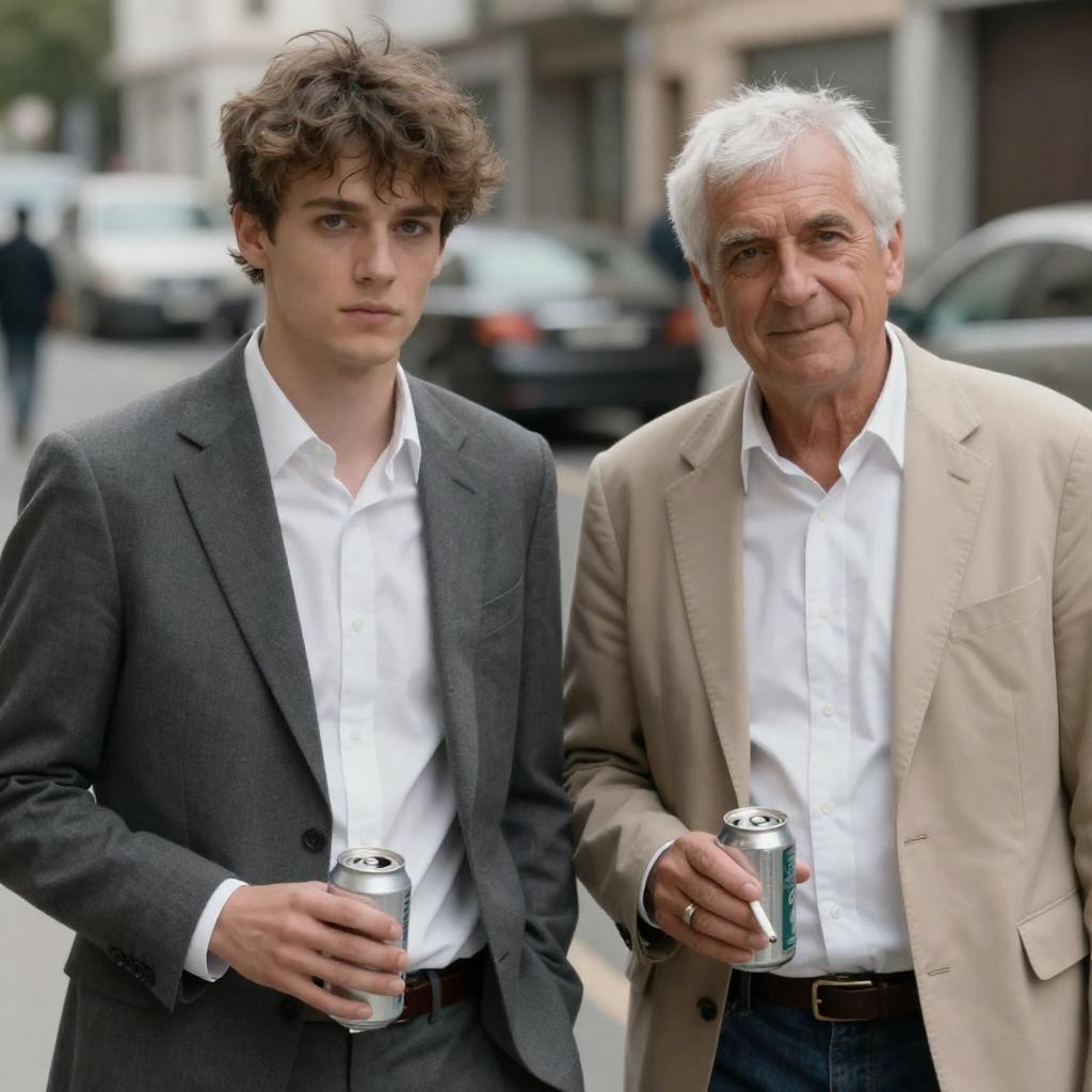 Two men standing on a street. Young man with messy brown hair in a gray suit, white shirt, holding a can. Older man with white hair in a beige blazer, white shirt, holding a can and cigarette. Blurred urban background with cars. Young man's intense gaze, older man's slight smile. Both holding cans in their right hands.