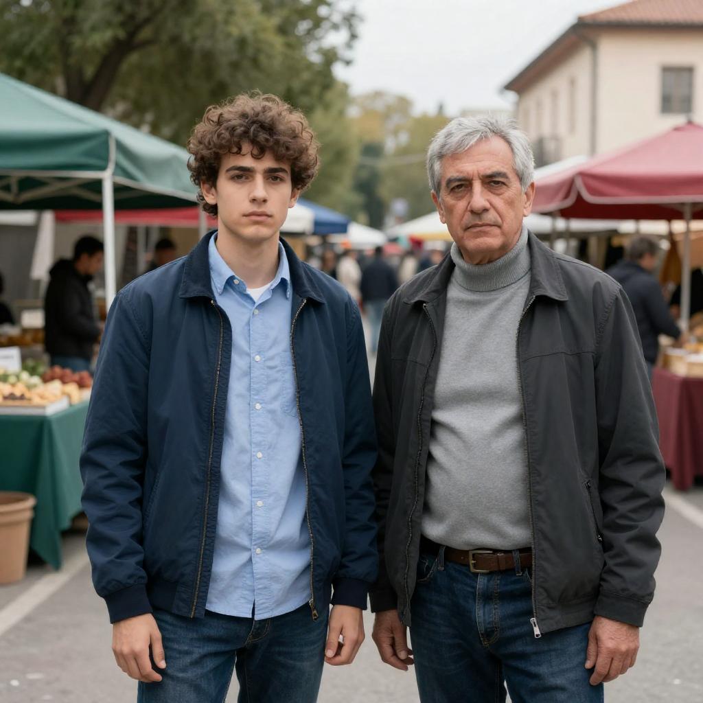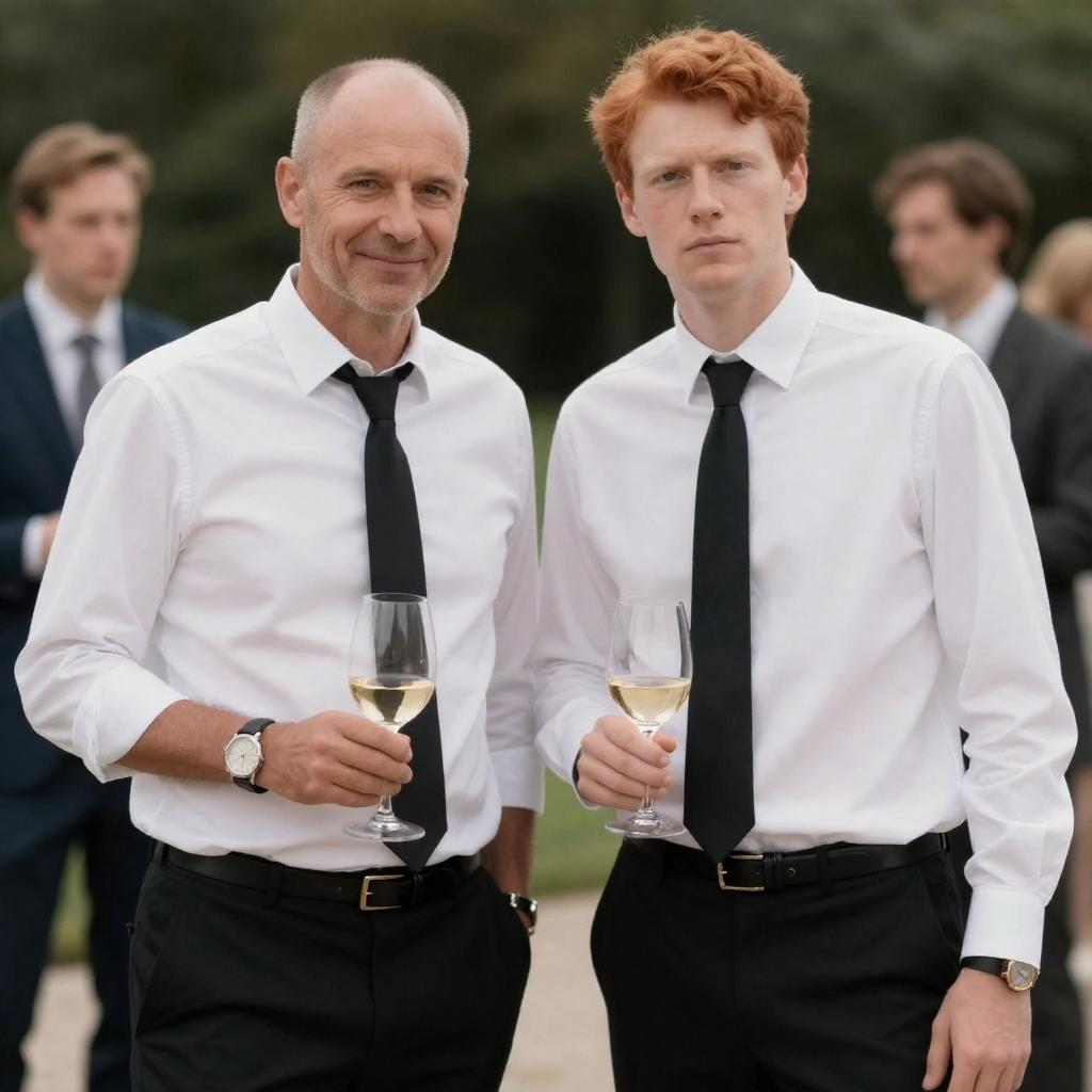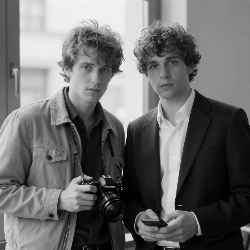 Two men standing on a street. Young man with messy brown hair in a gray suit, white shirt, holding a can. Older man with white hair in a beige blazer, white shirt, holding a can and cigarette. Blurred urban background with cars. Young man's intense gaze, older man's slight smile. Both holding cans in their right hands.
