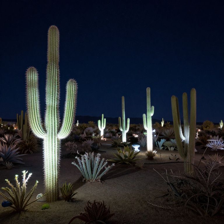 In a nocturnal desert landscape, crystalline cacti emit a soft, ethereal glow, creating a surreal garden of luminescent life beneath a star-studded sky.