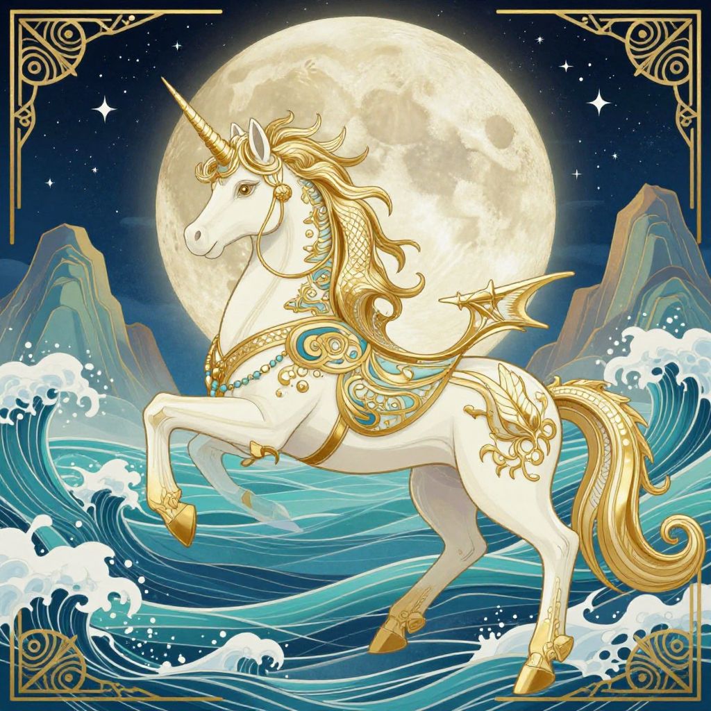 A fantastical creature blending a unicorn and dragon in an art deco style, featuring intricate gold details and flowing mane. Set against a vibrant ocean wave background with mountains and a large, decorative full moon under a starry sky. The creature combines mystical elegance with dynamic marine scenery.