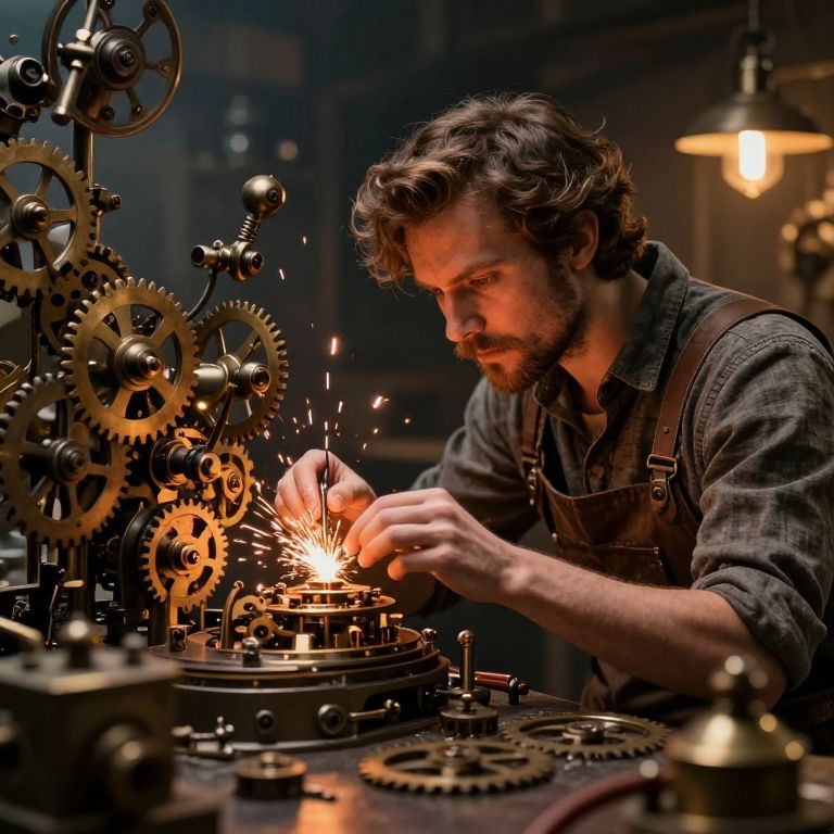 Creando a visionary inventor in a steampunk workshop filled with intricate gears and mechanical devices, crafting a unique invention with intense focus while sparks fly, blending technology and artistry in a richly detailed environment.