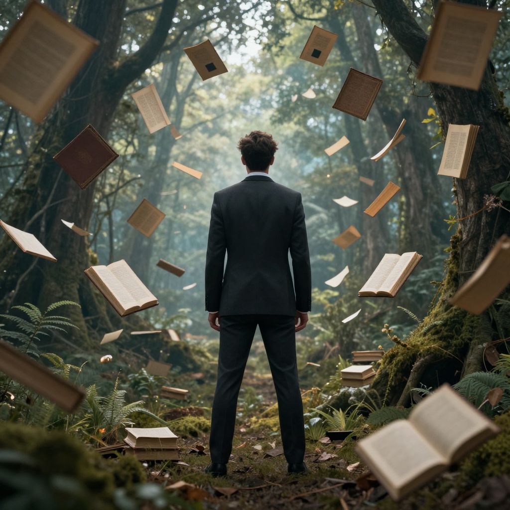 In a surreal, cyberpunk-inspired digital artwork, a hooded figure stands amidst towering bookshelves in a library city where floating pages, shifting between languages and eras, create a mesmerizing visual effect under dramatic golden-hour lighting.
