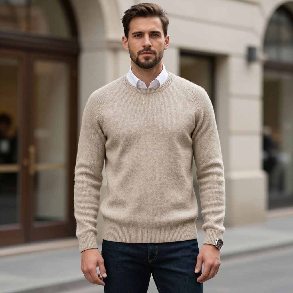 Photograph of a handsome, light-skinned man with short brown hair and a trimmed beard. He wears a beige, knitted sweater over a white collared shirt, and dark blue jeans. His left wrist has a black watch. He stands on a city street with an arched, beige building in the background, featuring large windows with dark frames. The street is paved, and the overall scene is urban and sophisticated. The man's expression is neutral, and he looks directly at the camera. The image has a slight, realistic CGI filter.