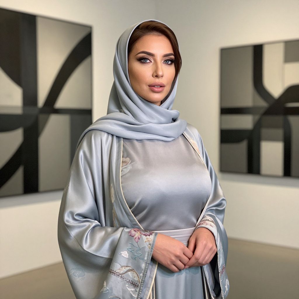 A poised Arab woman in her 40s with soft golden-brown skin and gentle blue eyes wearing a sophisticated abaya style costume with a tailored fit and subtle floral patterns, posed in front of a contemporary art gallery in Istanbul with abstract patterns reflecting on the walls.. The woman has big breasts and cute face