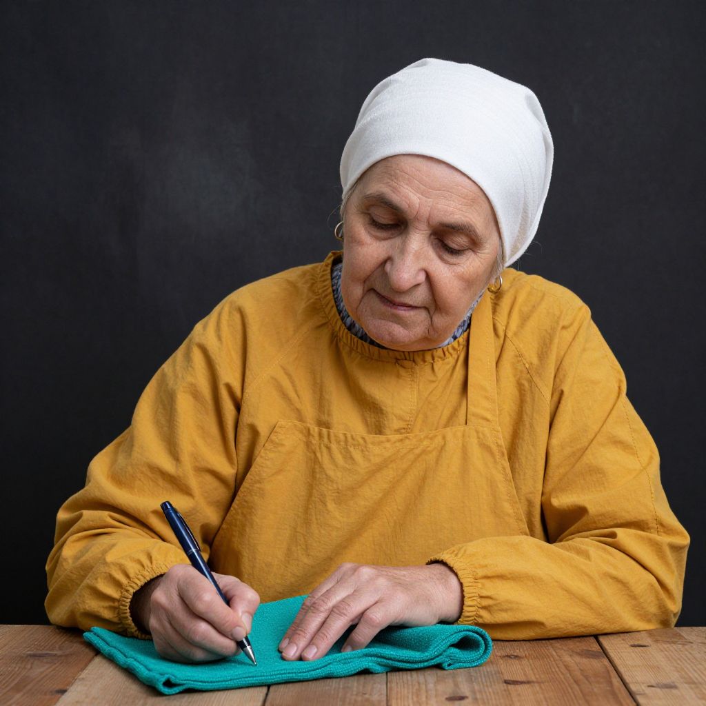 Elderly woman wearing a white headscarf and mustard-yellow apron sits at a wooden table, intently writing with a pen on a teal cloth, her expression focused and serene against a dark, textured background.