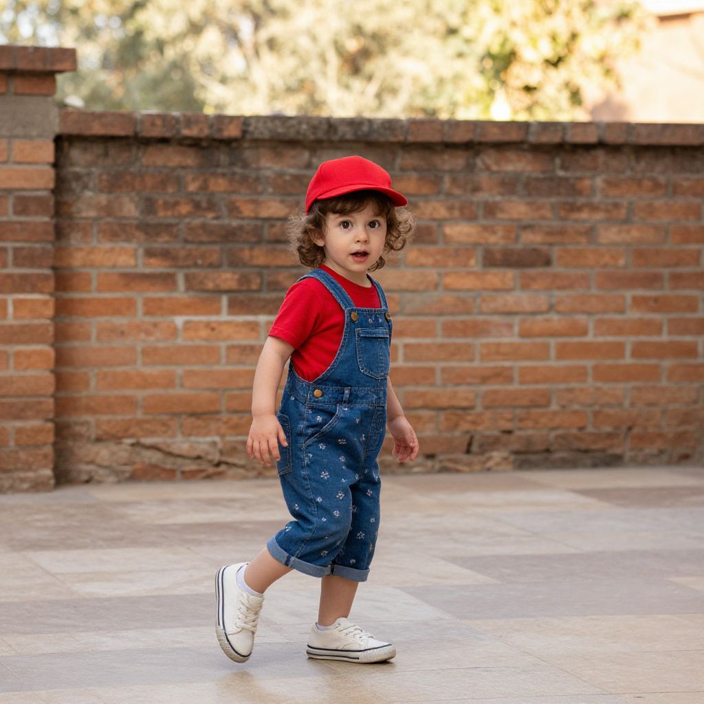 Photograph of a young toddler with curly brown hair, wearing a bright red cap, red shirt, and blue denim overalls with white star patterns. The child is also wearing white sneakers with black stripes and is walking on a concrete surface. The background features a weathered red brick wall with some greenery and sunlight filtering through in the distance. The toddler has a curious expression and is slightly off-center to the right. The overall scene is brightly lit with natural sunlight.