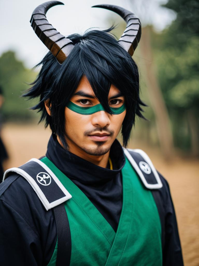 Photo-realistic cosplay photo of person in aragami oga costume. 1boy, dark-skinned male, single horn, sharp teeth, green eyes, hair between eyes, hair over one eye, eyepatch, black hair, short hair, black gloves, virtual youtuber, virtual youtuberlifestyle stock photo, shallow depth of field, lifestyle stock photography, shallow depth of field, natural lighting, warm tones, soft background blur, candid moments, vibrant colors, realistic textures, modern casual clothing. full body shot