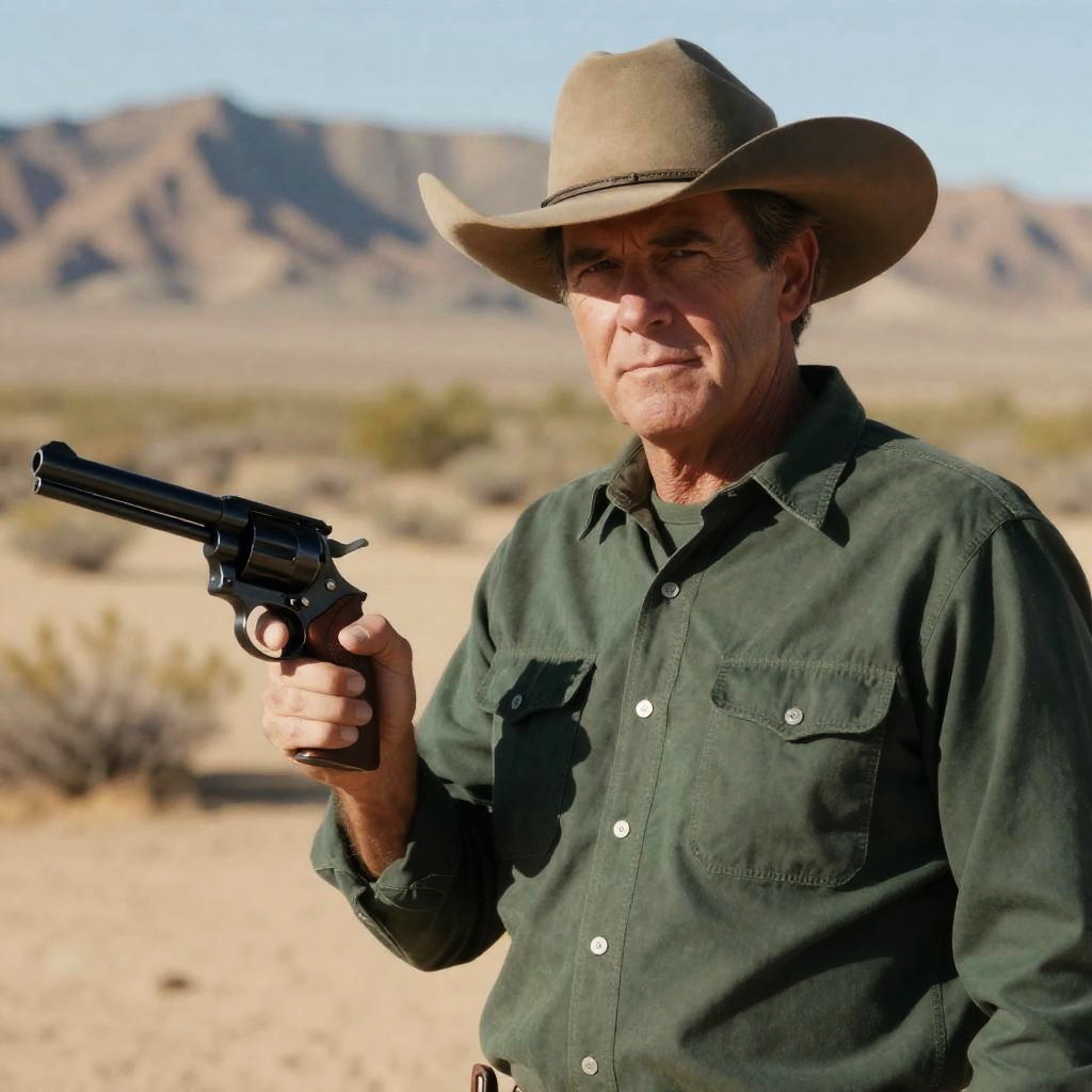 Photograph of a middle-aged man with light skin, blonde hair, wearing a light blue shirt with a sheriff's badge and a gray cowboy hat, looking upward into a bright sun in a clear sky. He has a serious expression. The background is a simple, clear blue sky. He is centered, facing slightly upward.