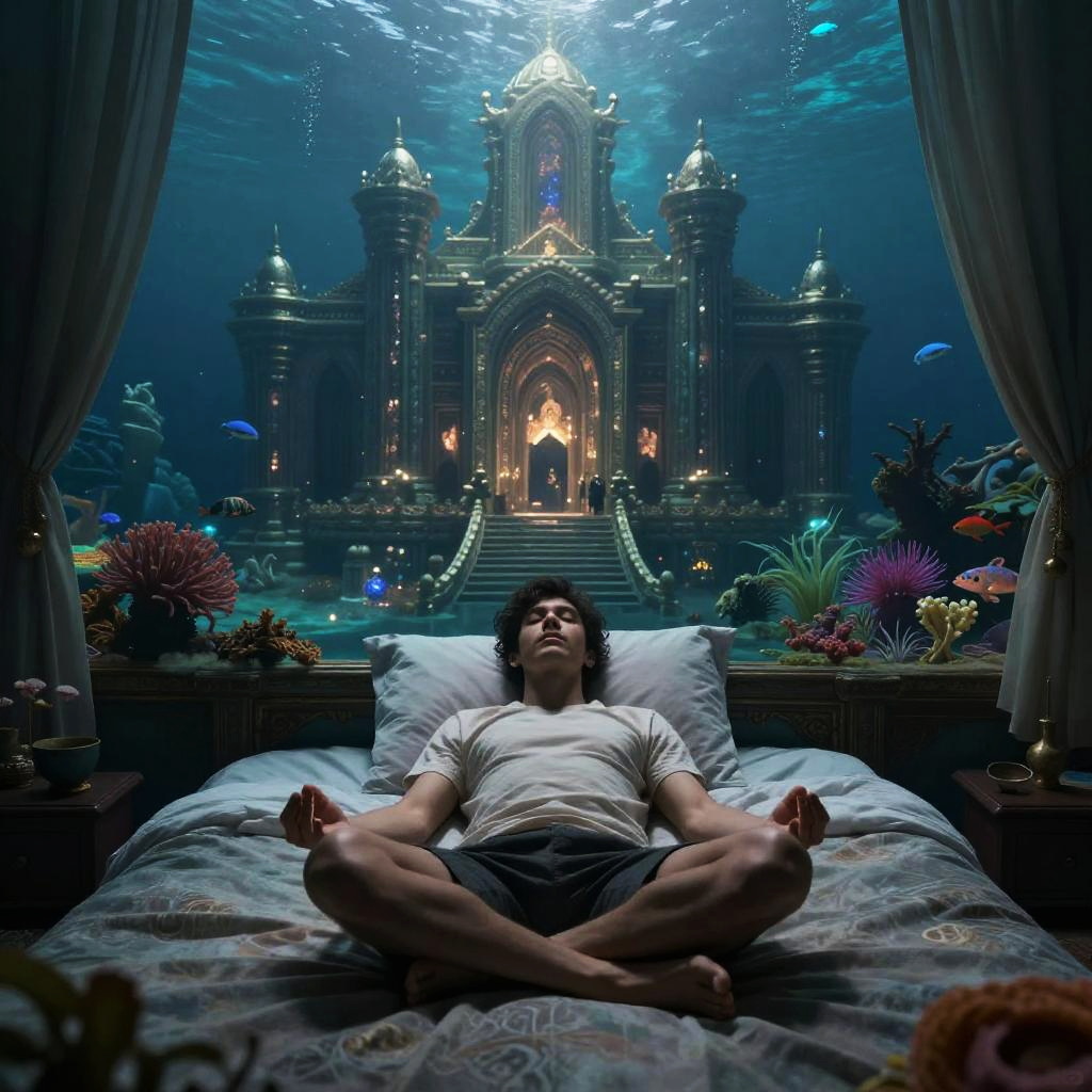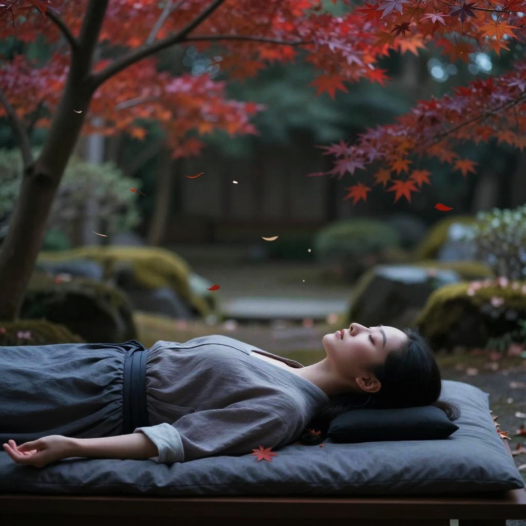 One young woman laying flat on a bed meditating and imagining a serene Japanese maple garden with red foliage and softly falling leaves, the scene looks spiritual, dreamy, and magical, with a cinematic ultra-realistic rendering in 8k, dramatic lighting, extreme detail.