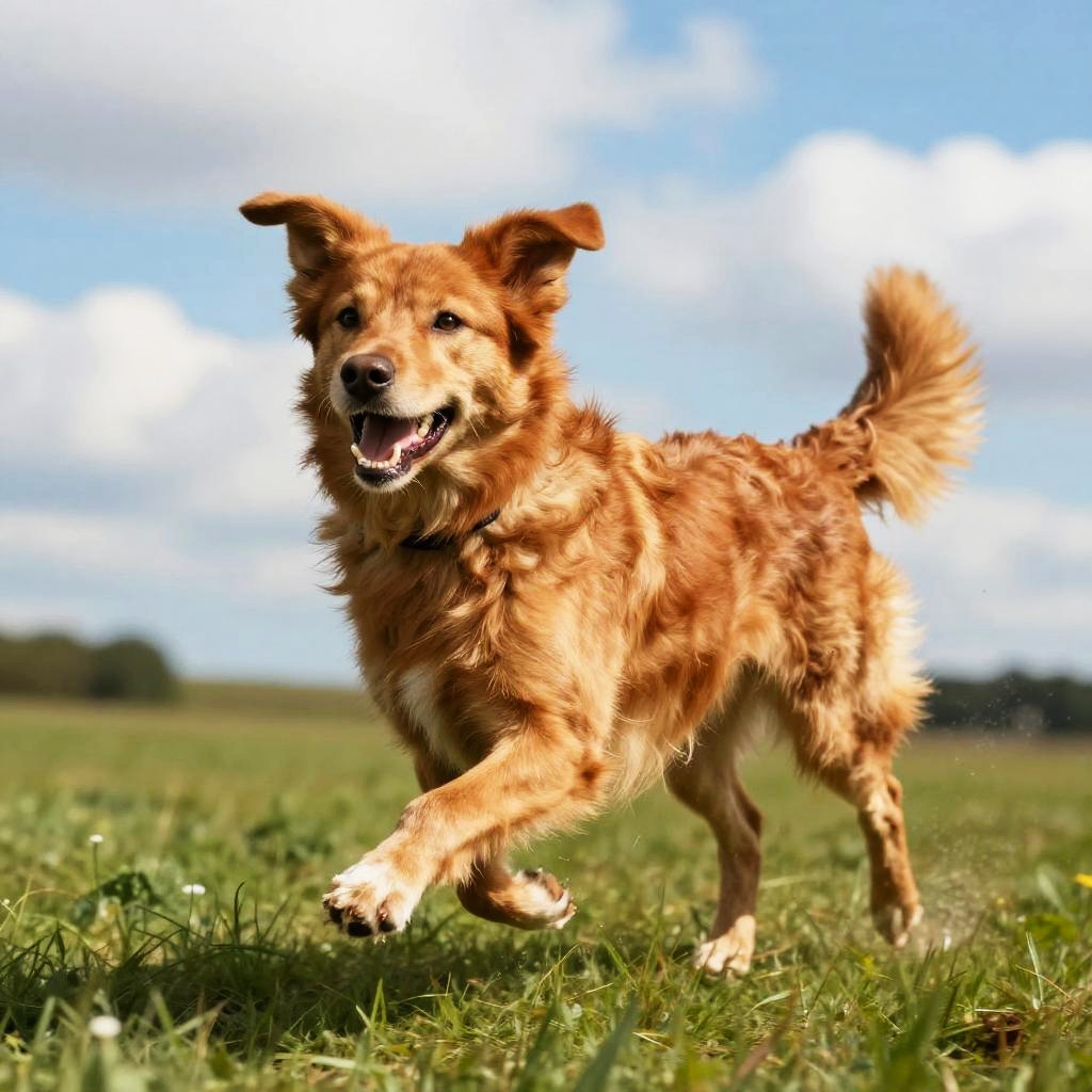 Redhead dog running joyfully across a green meadow, energetic pose, blue sky with fluffy clouds, hyper-realistic details, dynamic motion blur