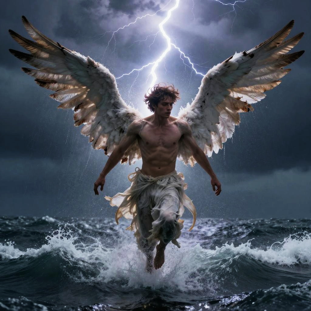 Muscular greek god statue with flowing cape, positioned on rocky cliff overlooking stormy sea, dynamic wind effect on cape and hair, thunderstorm clouds swirling above, intricate sculptural detail highlighting raw power and divine presence