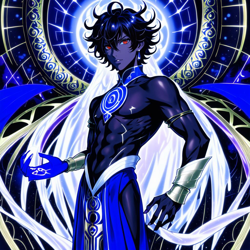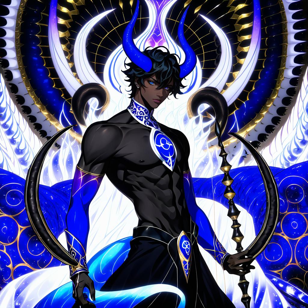 Arjuna alter (fate), fate/grand order, 1boy, dark-skinned male, glowing horns, blue horns, tail, horns, hair between eyes, black eyes, long hair, white hair, black hair, short hair, topless male, jewelry, by artist samidare (hoshi), anime