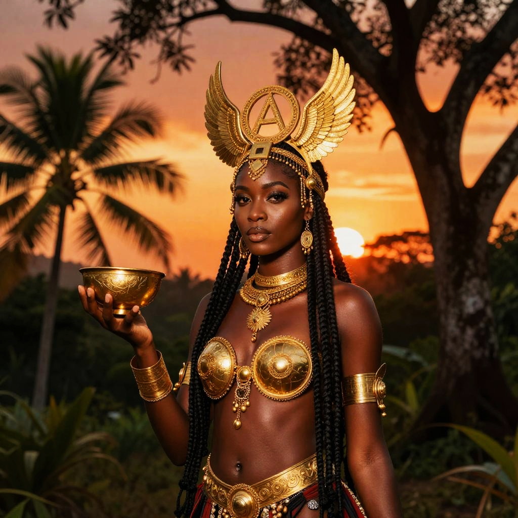 Photograph of a dark-skinned African woman with long braids, standing in a tropical forest at sunset. She's wearing an ornate golden headdress with wings, a circular A symbol, and matching golden jewelry, including a breastplate and armlets. She holds a small golden bowl in her right hand. The sky is vibrant orange, with palm trees and a large tree in the background.