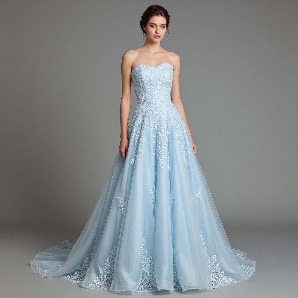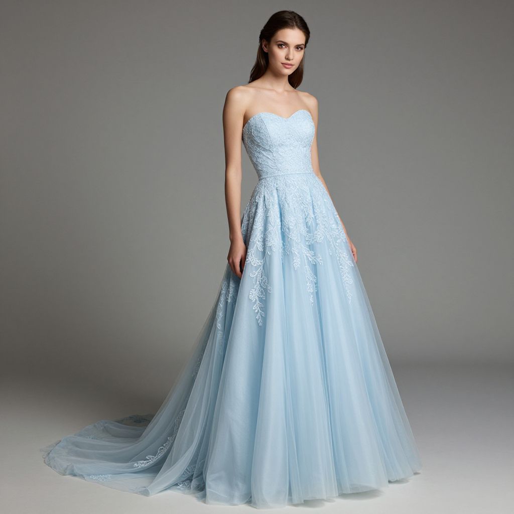 Elegant woman showcasing a strapless light blue wedding gown with intricate lace detailing on the bodice and a flowing tulle skirt against a neutral gray background.