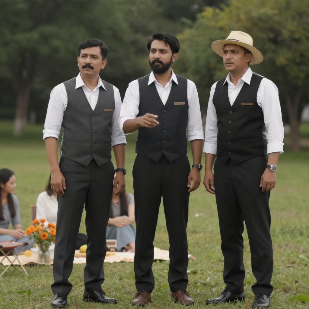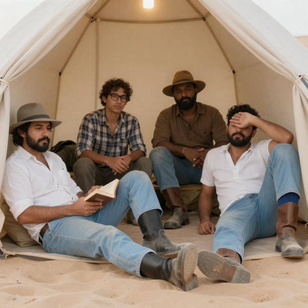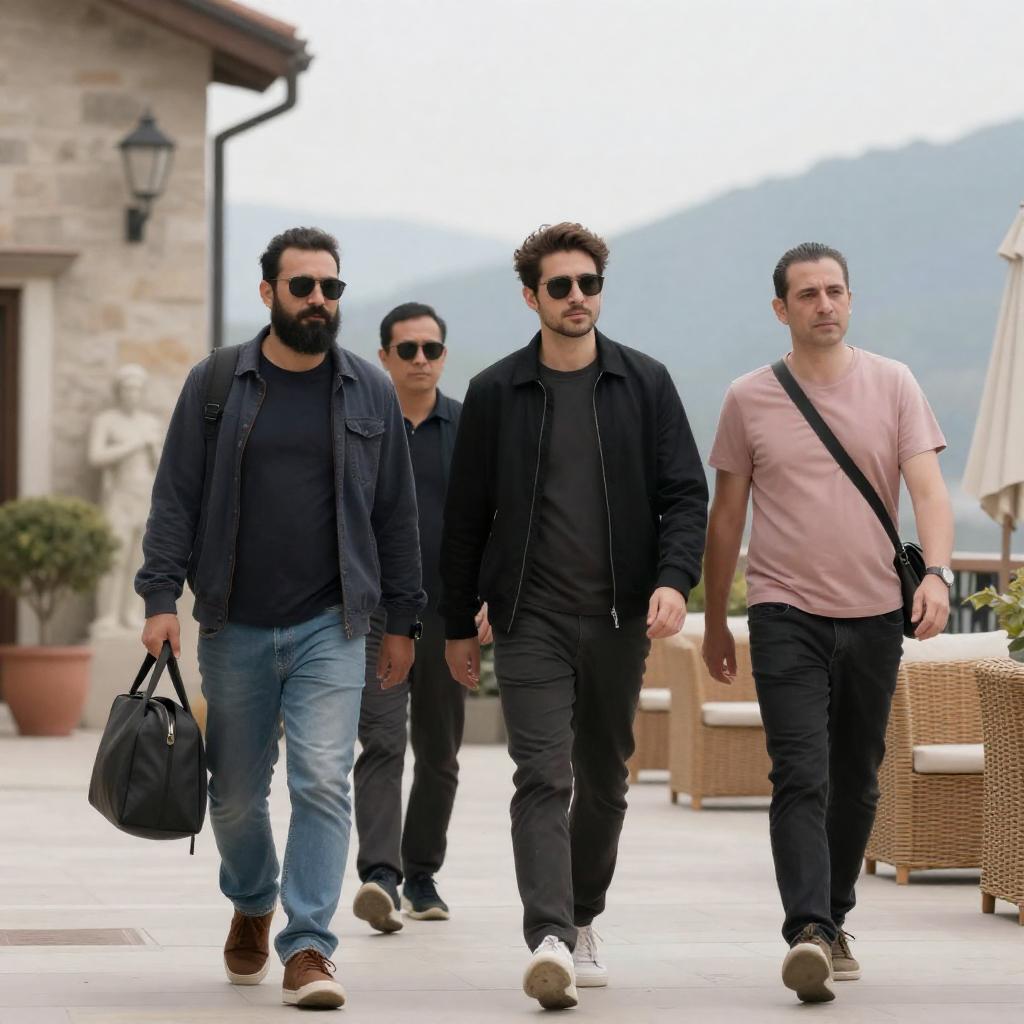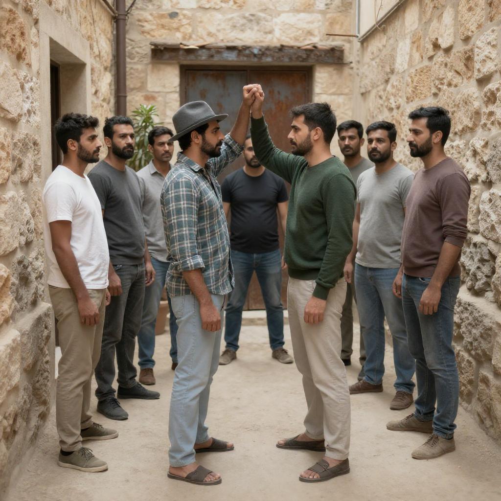 Group of men in a narrow, stone-walled alley. Central man with green plaid shirt, light blue pants, and grey hat faces off with another man in a green sweater, light pants. Surrounding men, intense expressions, form semi-circle. Alley has beige stones, rusty metal door, and potted plant. Men in various shirts, pants, and jackets. Central man raises arm, opponent squares off. Ground is dusty. Photograph.
